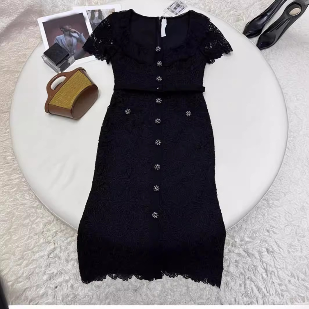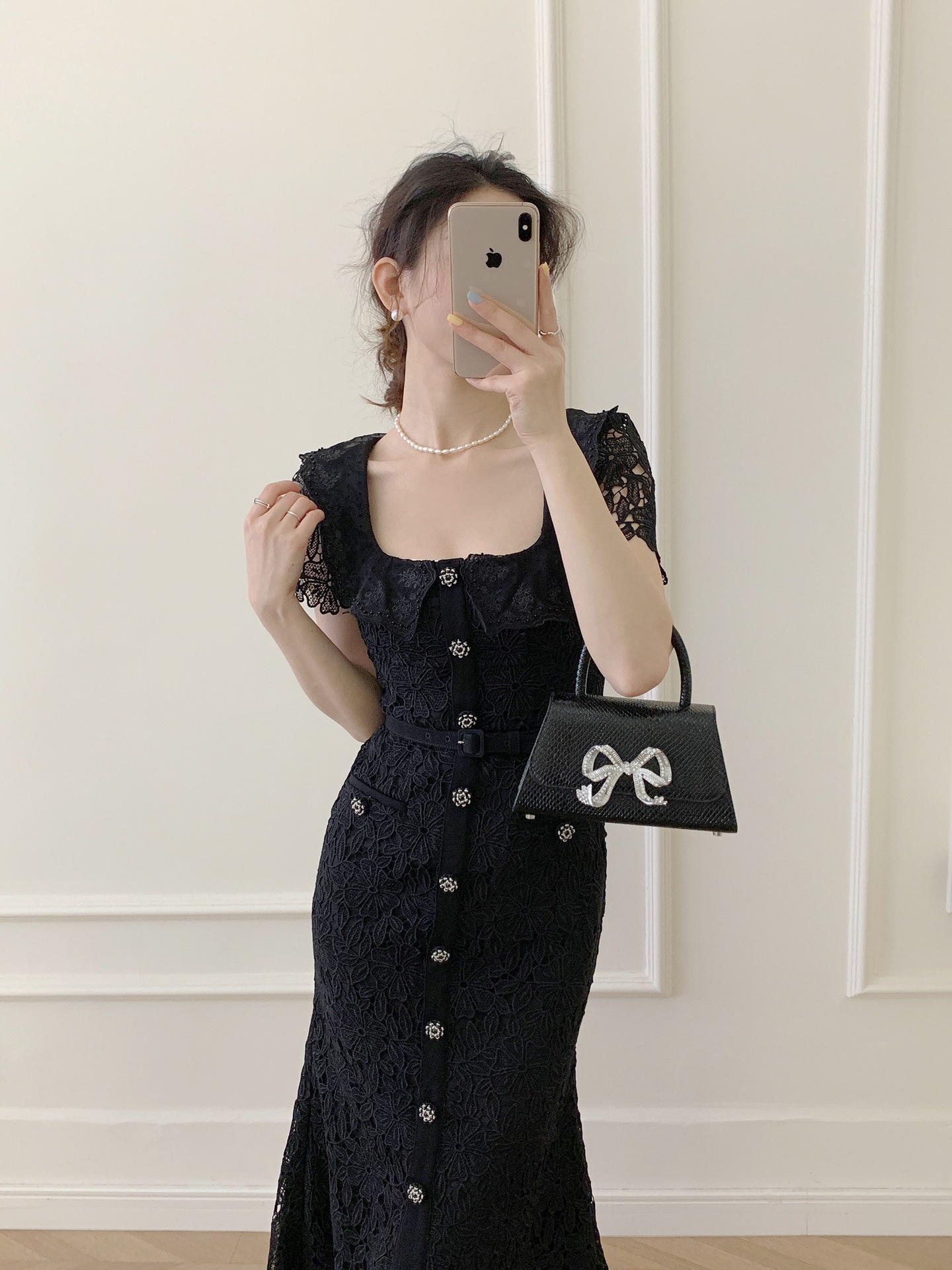 Product information: Pattern: solid color Skirt type: fishtail skirt Color: Black, Blue Waist type: high waist Size: S,M,L,XL Style type: temperament commute Solid color fabric name: lace Sleeve length: short sleeve