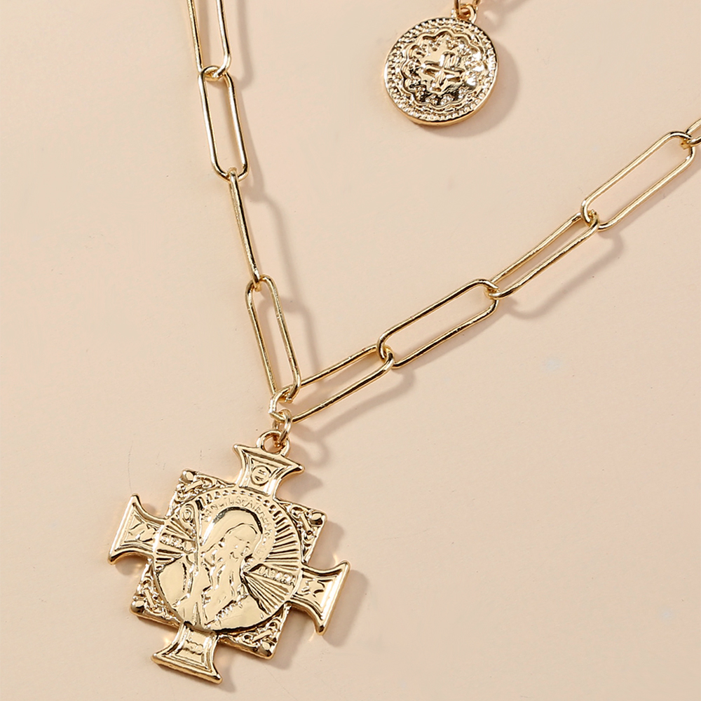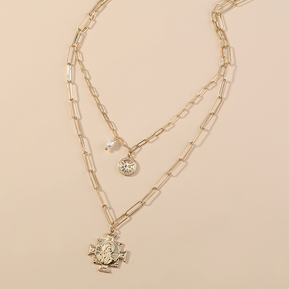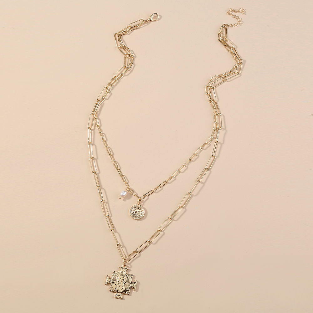 European and American cross-border jewelry Punk metal lattice chain character cross double layer necklace retro pearl necklace