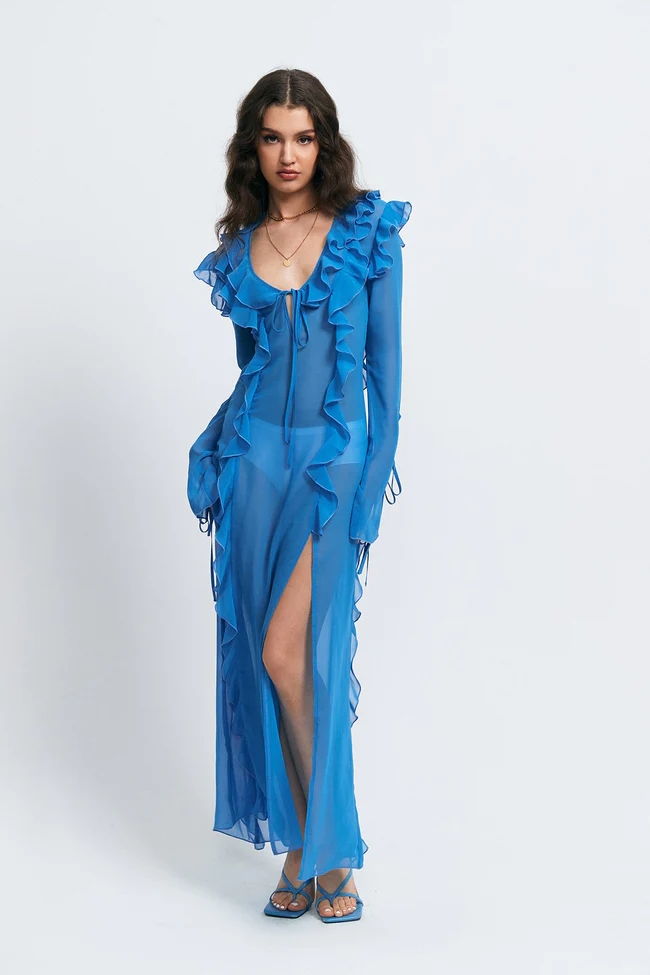 The New Women's Sexy Perspective Anti -car Edge -based Rope V -neck Open Fork Dress
