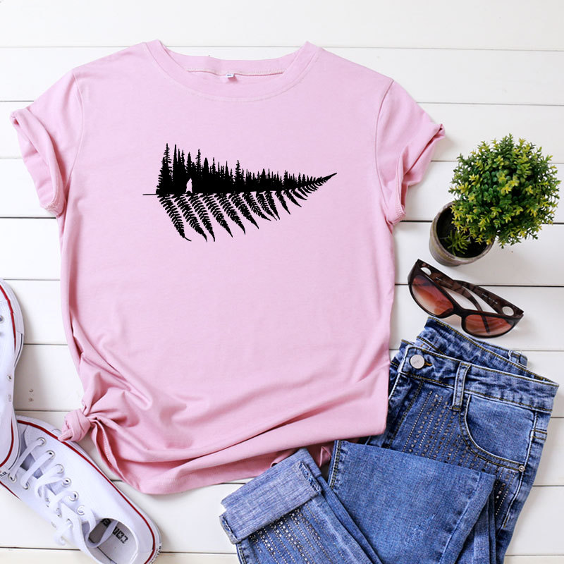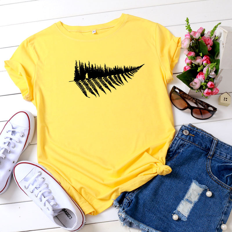 Women's Leaf Pattern Print Crew Neck Cotton Short Sleeves