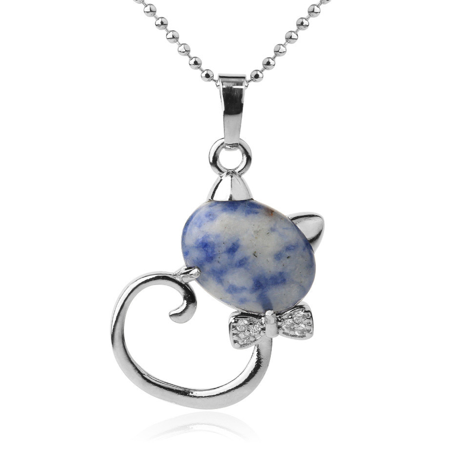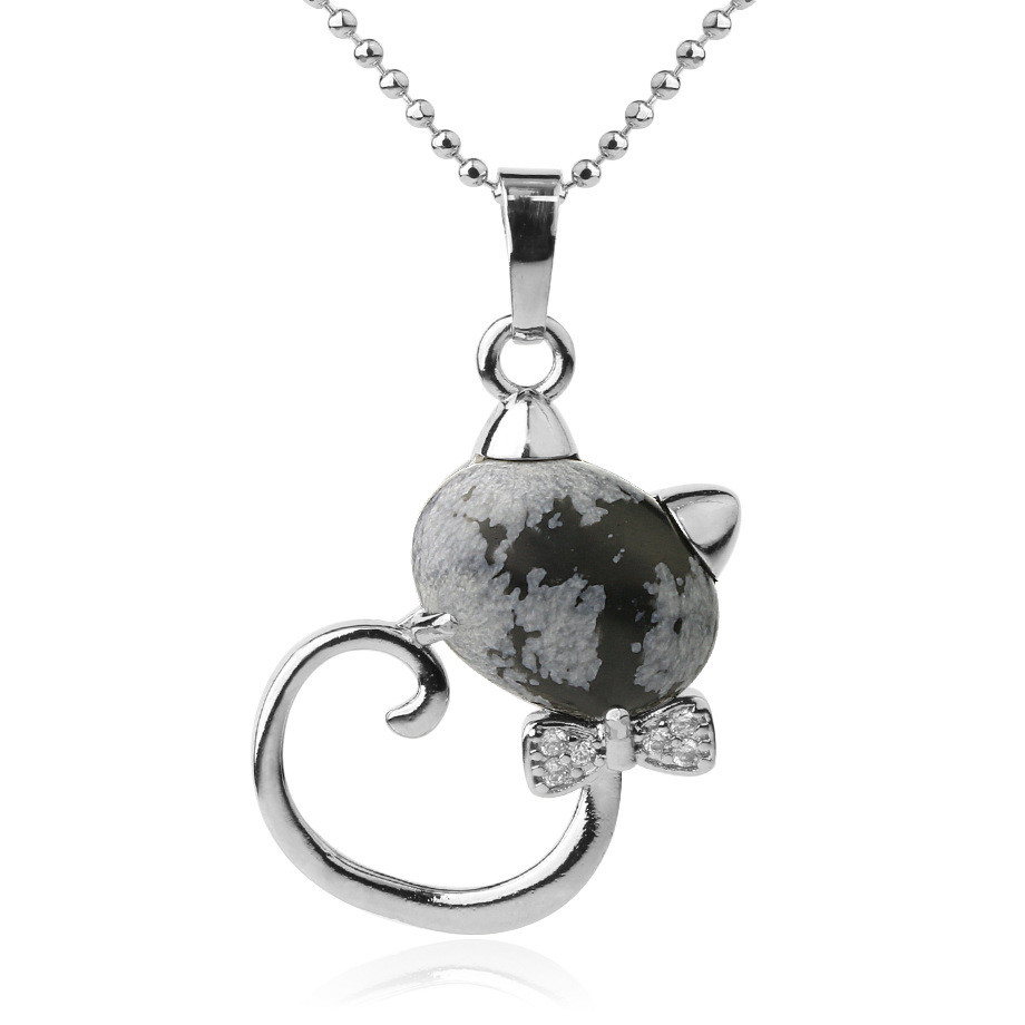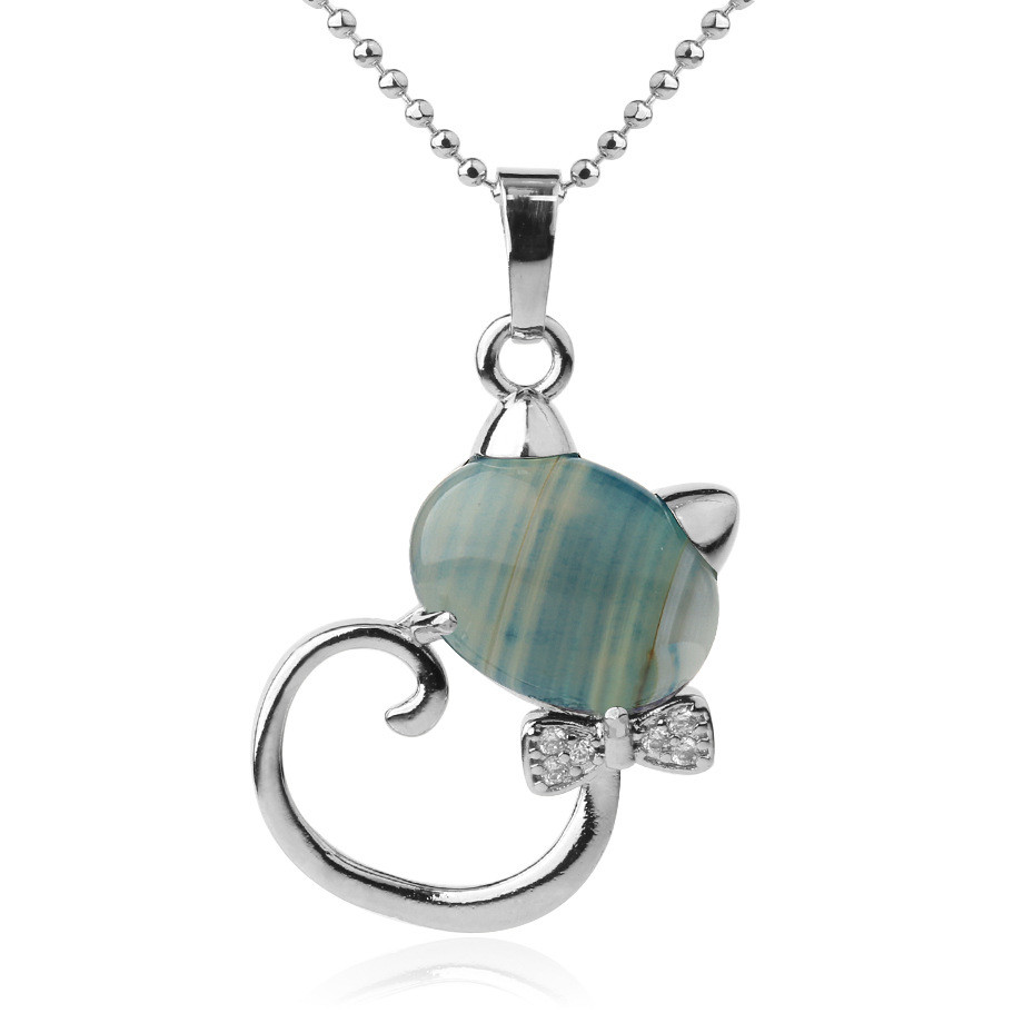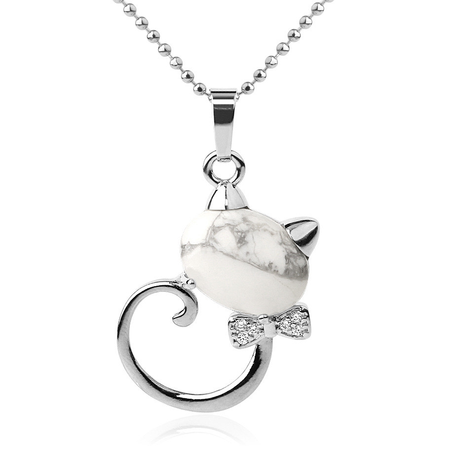 CSJA Animal Pendant Necklaces Natural Stone Cat Head Bow-knot Zircon CZ Silver Color Pendants Trendy Jewelry for Women Girl G538