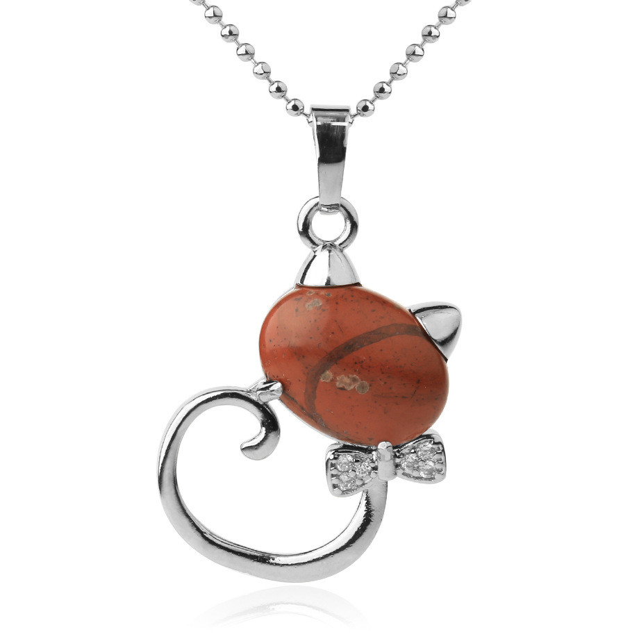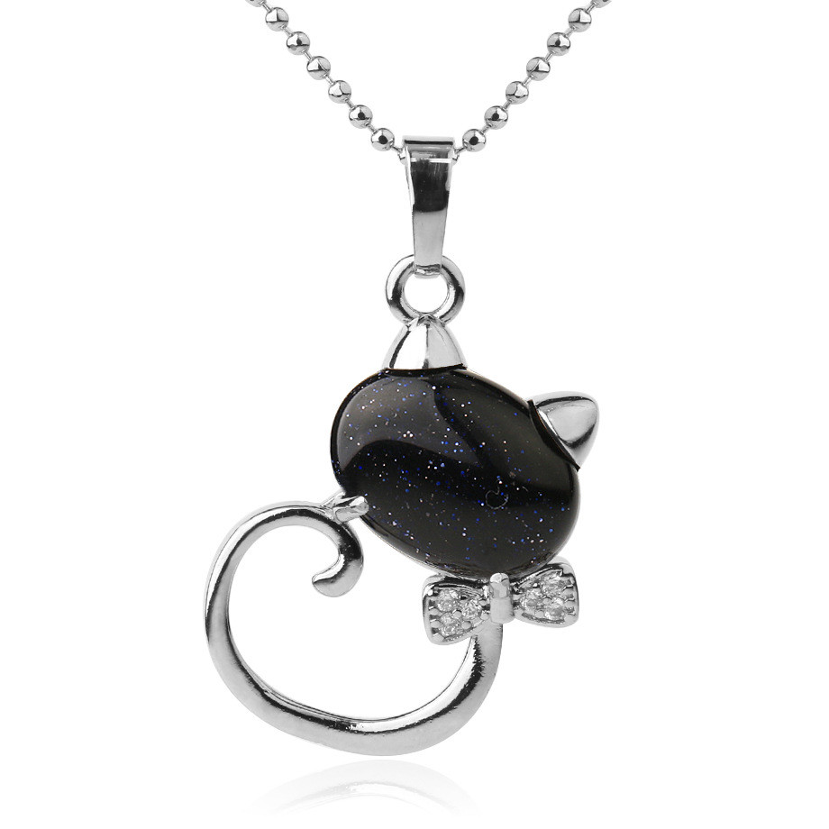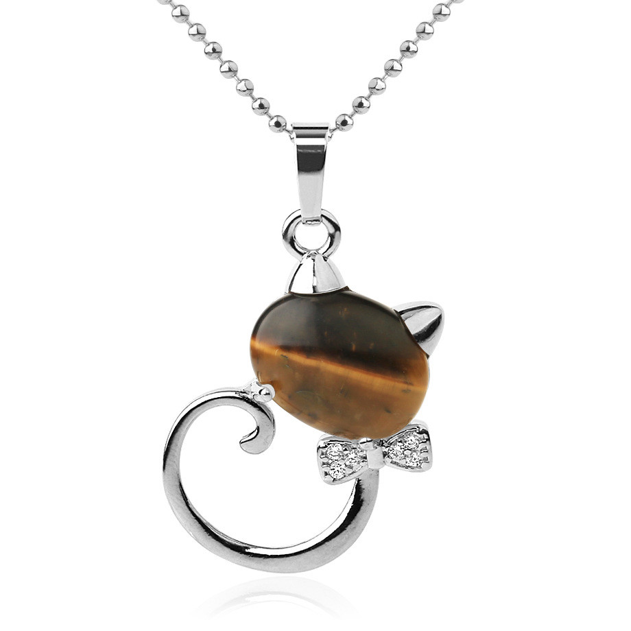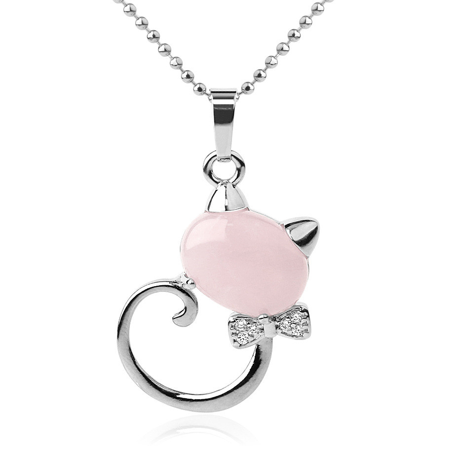 CSJA Animal Pendant Necklaces Natural Stone Cat Head Bow-knot Zircon CZ Silver Color Pendants Trendy Jewelry for Women Girl G538