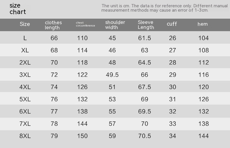 Size: L,XL,2XL,3XL,4XL,5XL,6XL,7XL,8XL