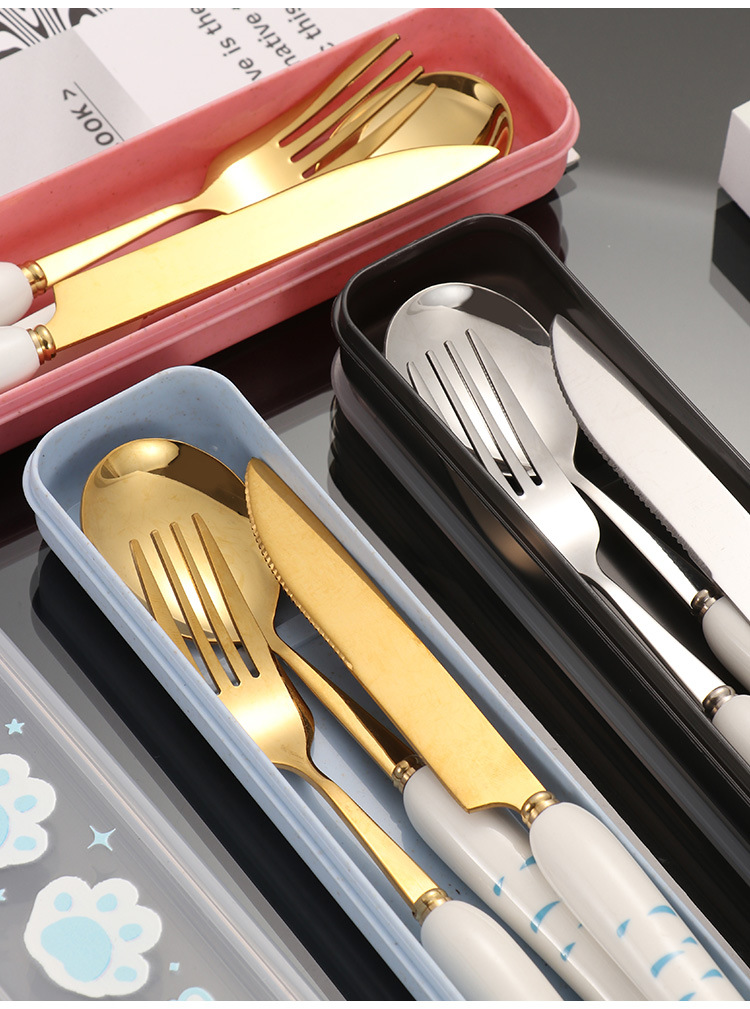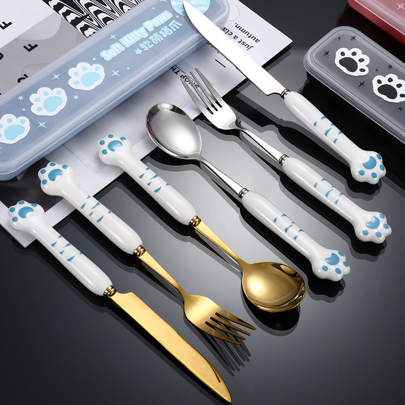 Specifications: White Blue Cat's Paw knife, fork and spoon silver, white blue cat's paw knife, fork and spoon gold, white powder cat's paw knife, fork and spoon silver, white powder cat's paw knife, fork and spoon gold