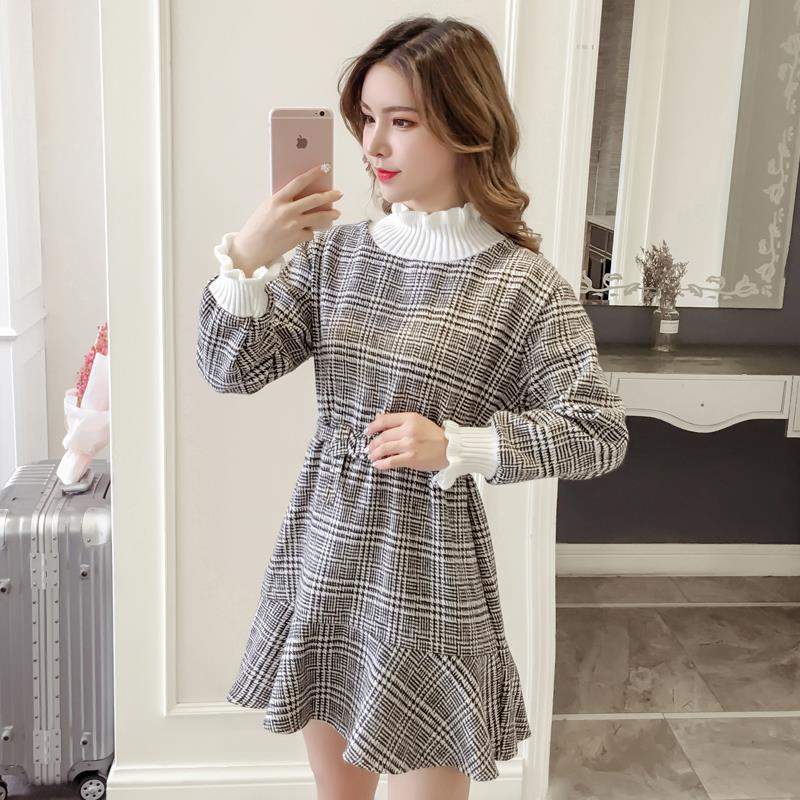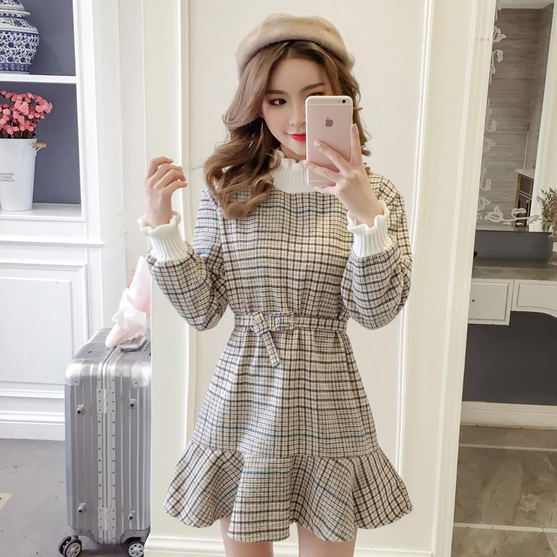 Style: OL commutingPattern: Stripes/GridSkirt length: middle skirtSkirt type: lotus leaf skirtCollar type: high collarColor: beige, pink, black
