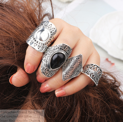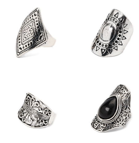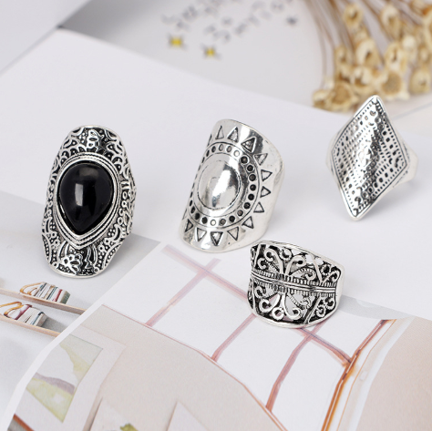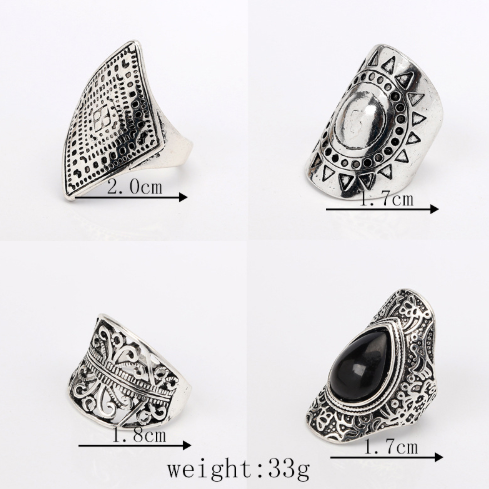 Vintage ethnic style black gemstone drop ring pierced engraved diamond 4 piece set ring Sun pattern