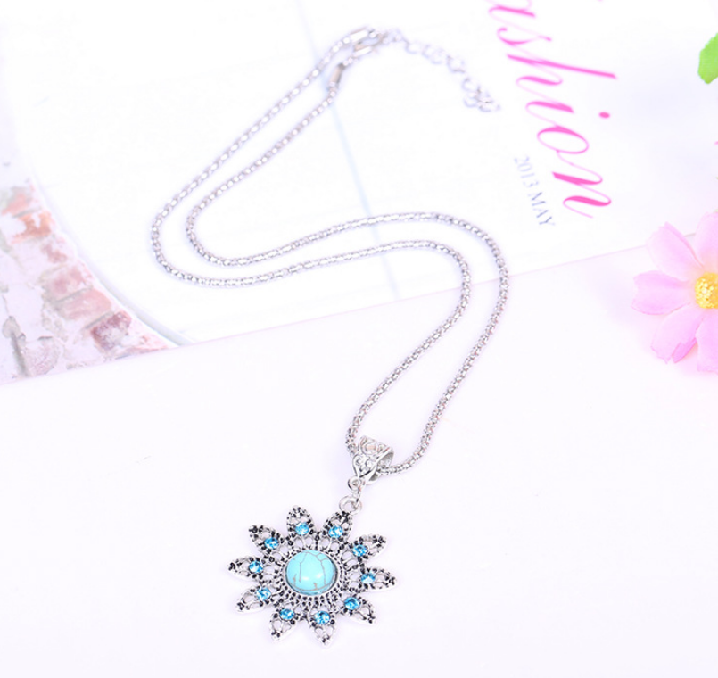 Vintage Fashion Carved Earrings Necklace Sun Flower Turquoise Set Necklace Earrings