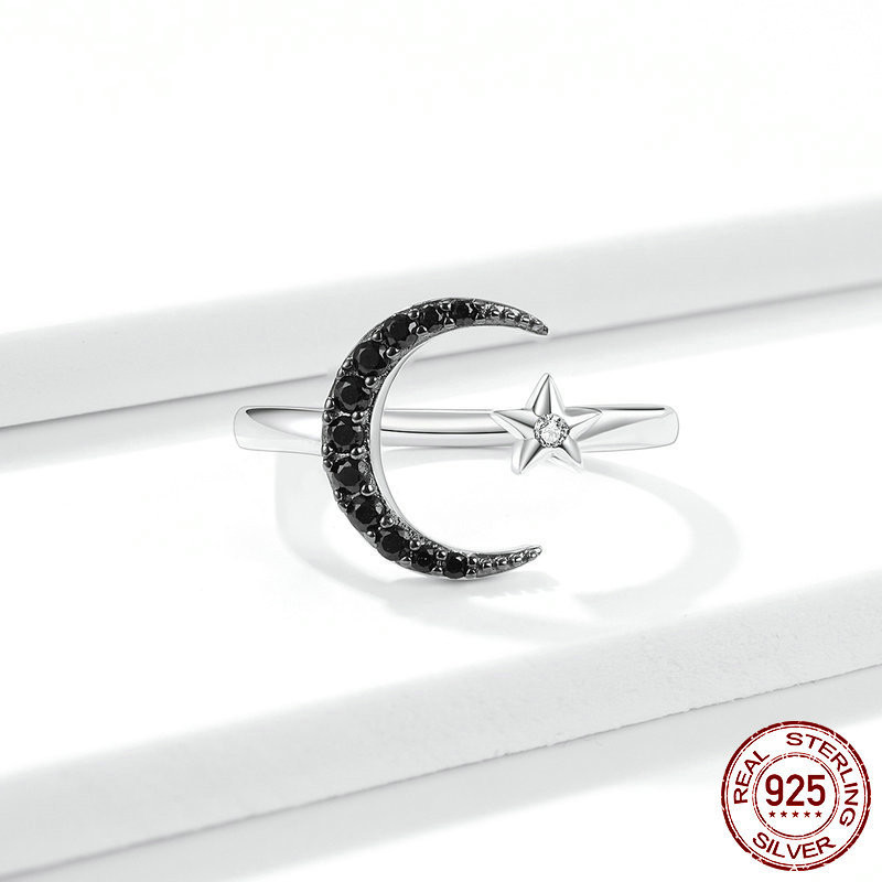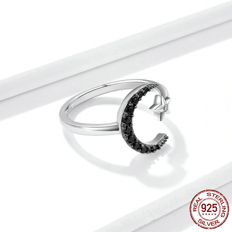 Silver Charm 2021 Star Moon Open Ring 925 Silver Black Mysterious Plated Ring Jewelry