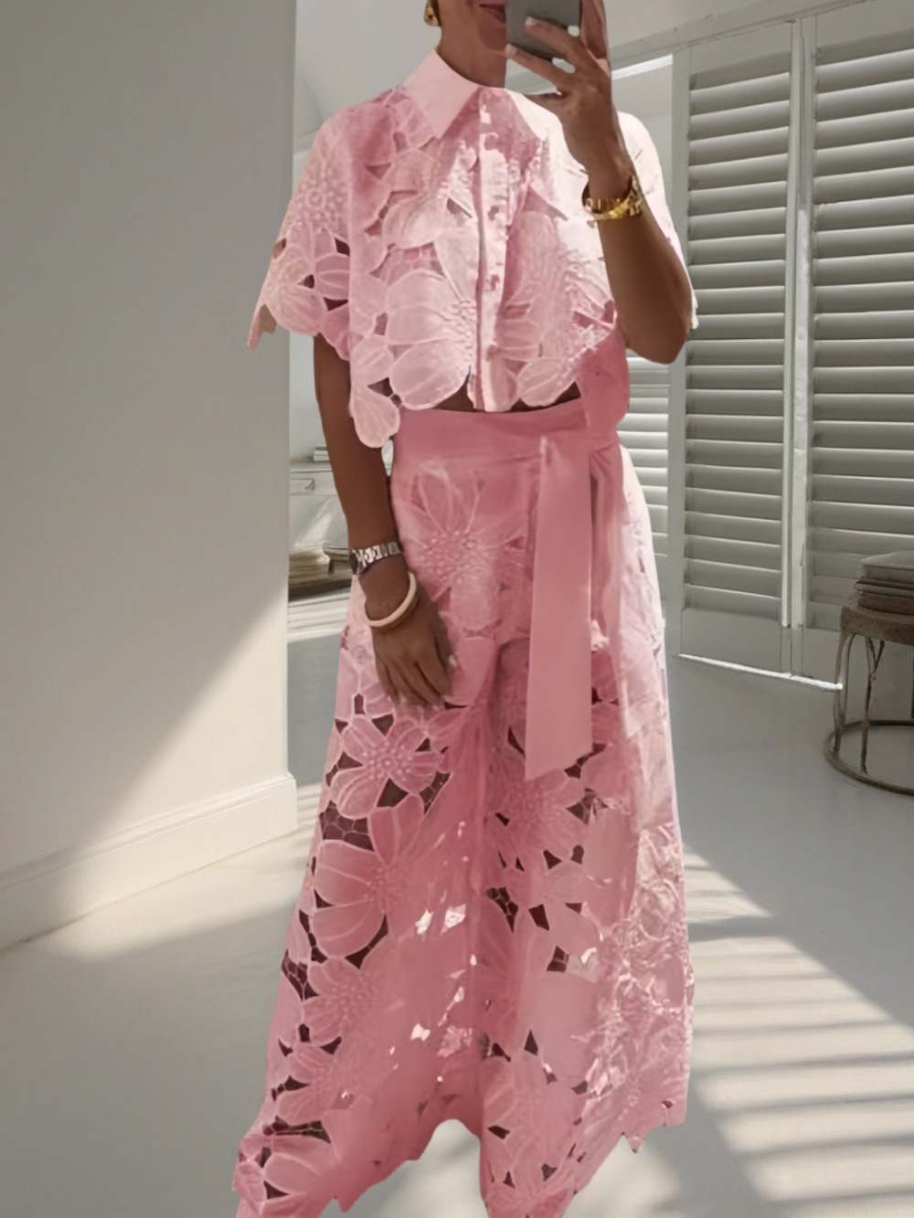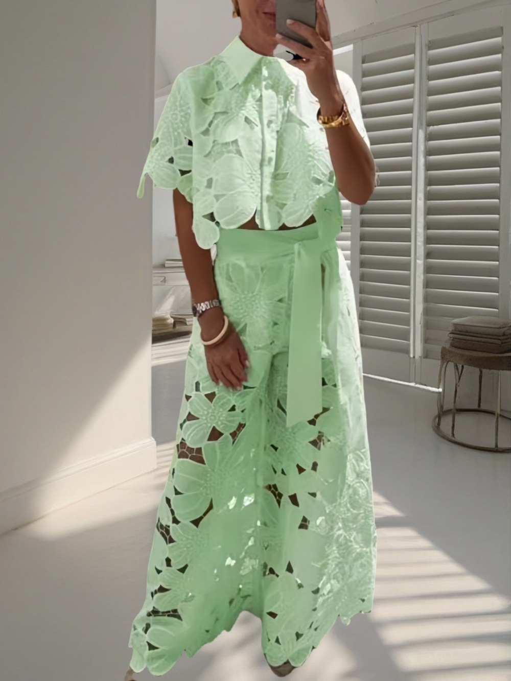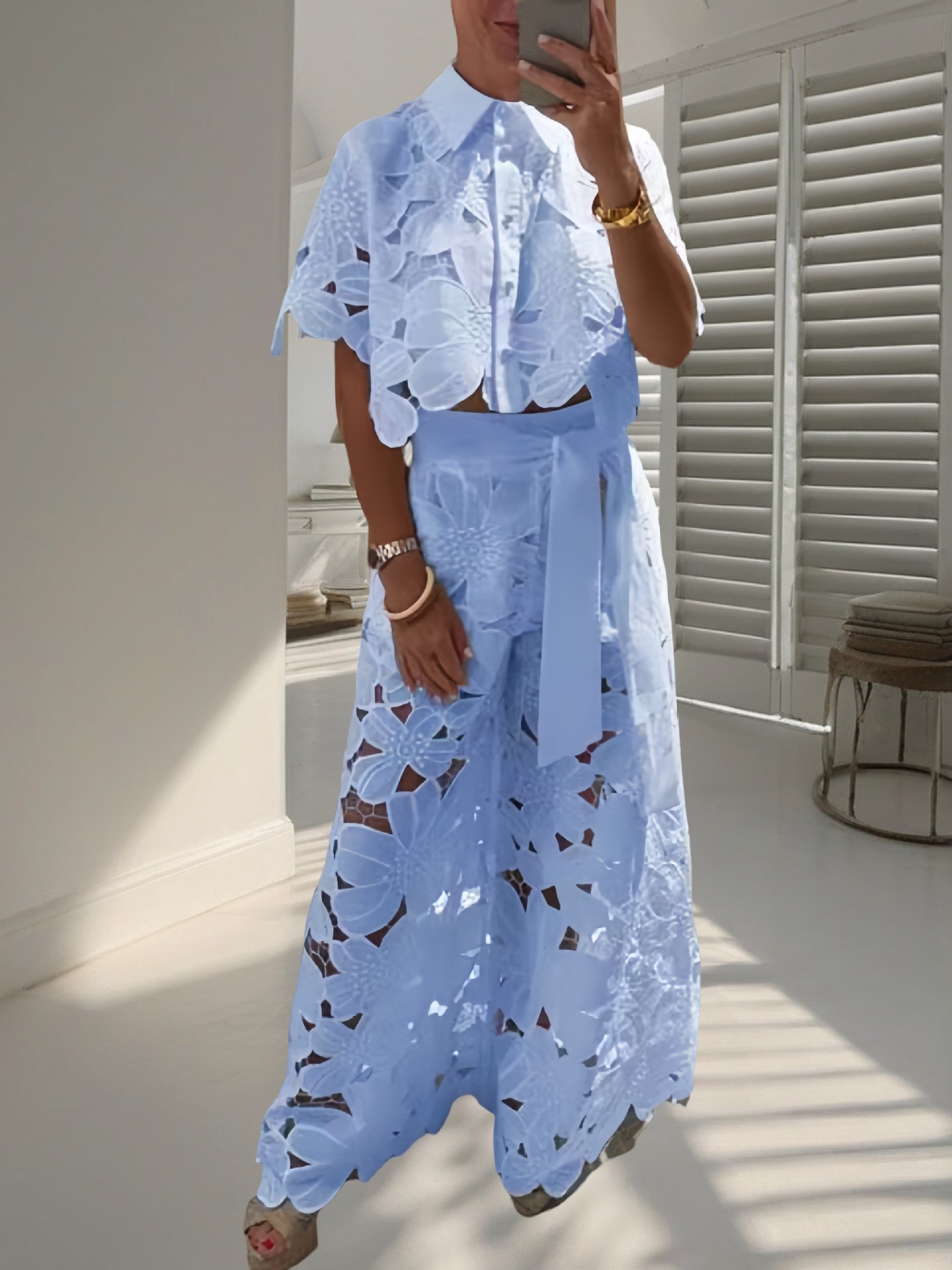 Two-piece set for women, including a pure-colored sexy cut-out cardigan top and wide-leg pantsNew summer embroidery half-sleeved shirt and pantsFabric name: Polyester fiber