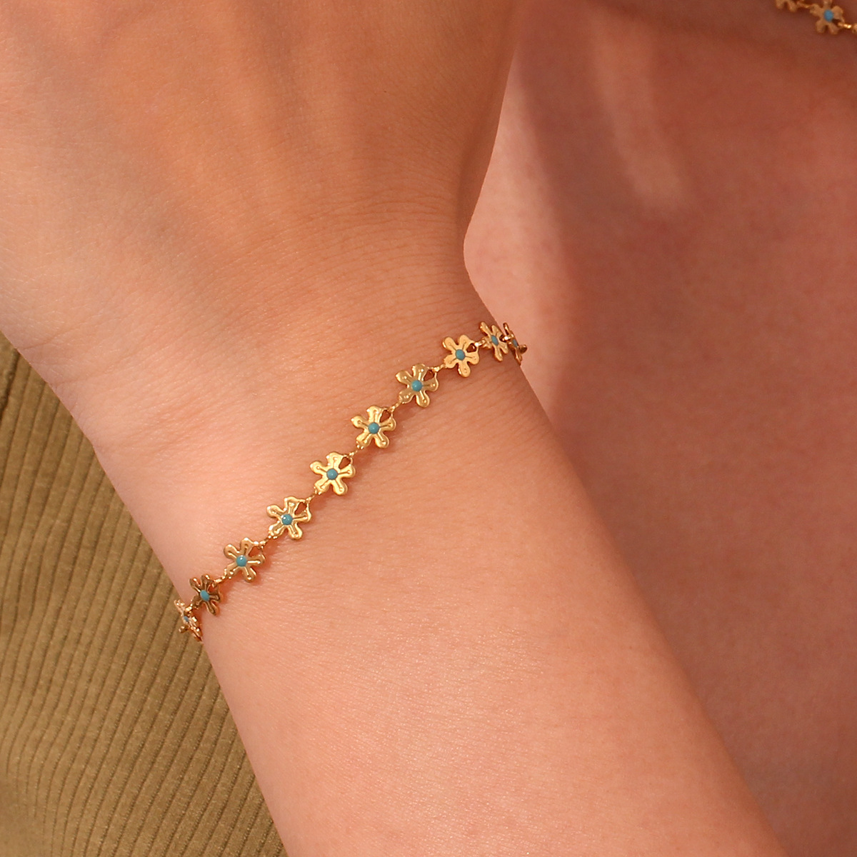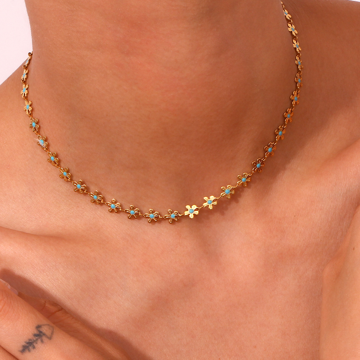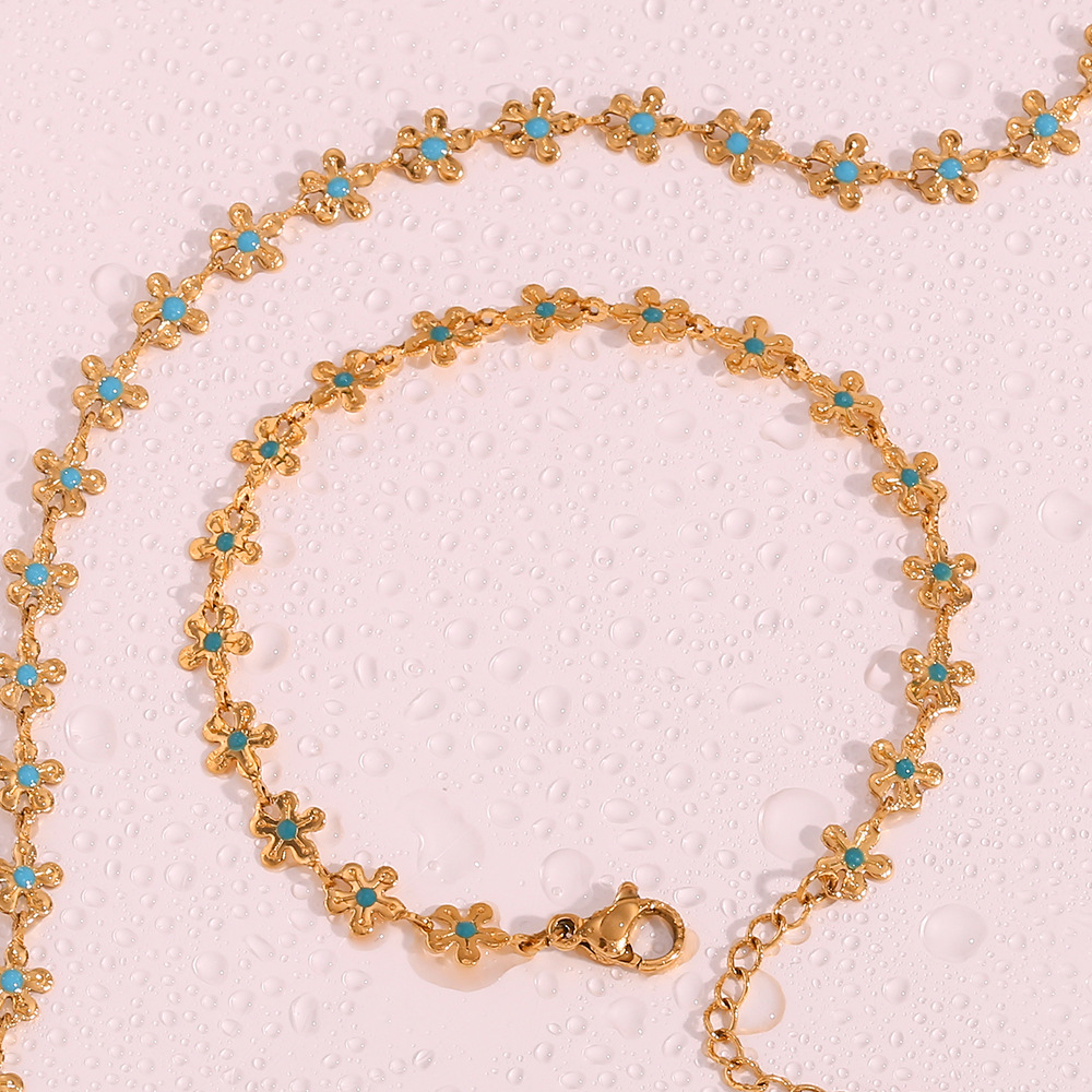 Color: blue oil dripping small flower handmade chain necklace-gold, blue oil dripping small flower handmade chain bracelet-Gold