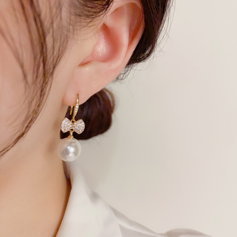 Product information:Color: zircon bow pearl ear hook (thick real gold) Applicable population: Female Material: Copper Shape: Bow Popular elements: Pearl Style: Japanese and South Korea