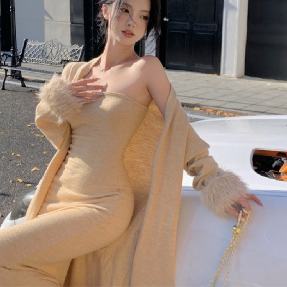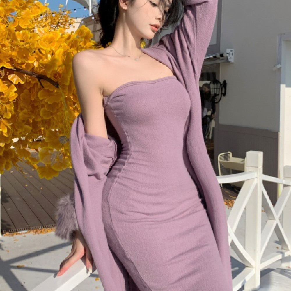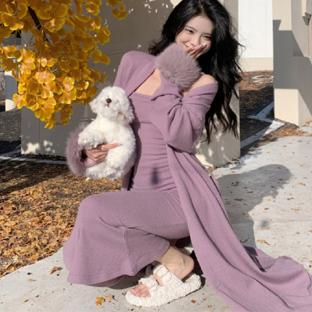 Color: Purple dress, purple cardigan, apricot dress, apricot cardigan