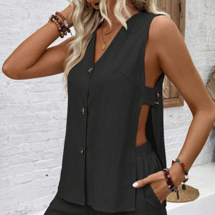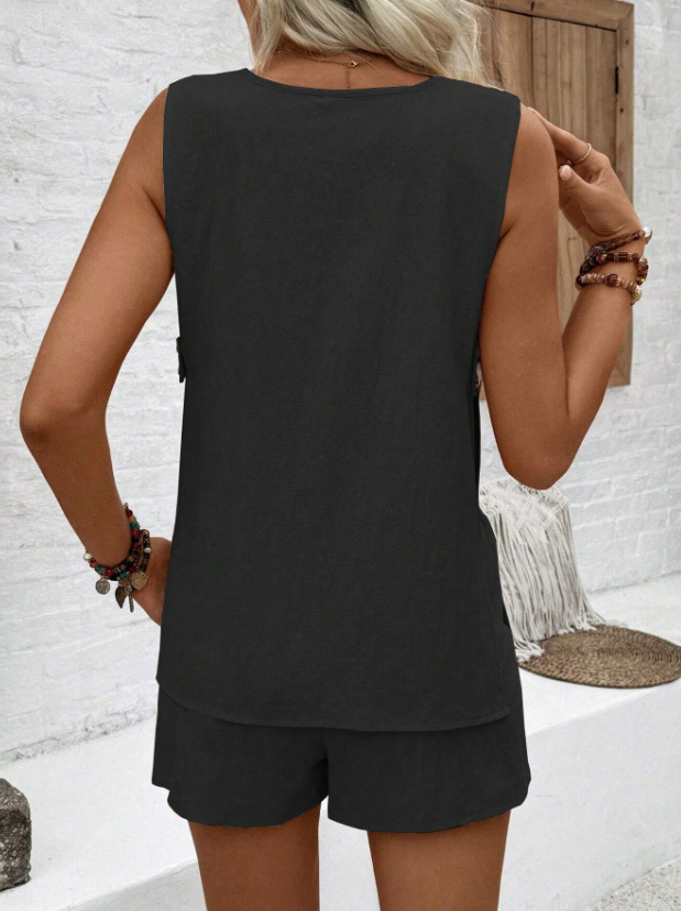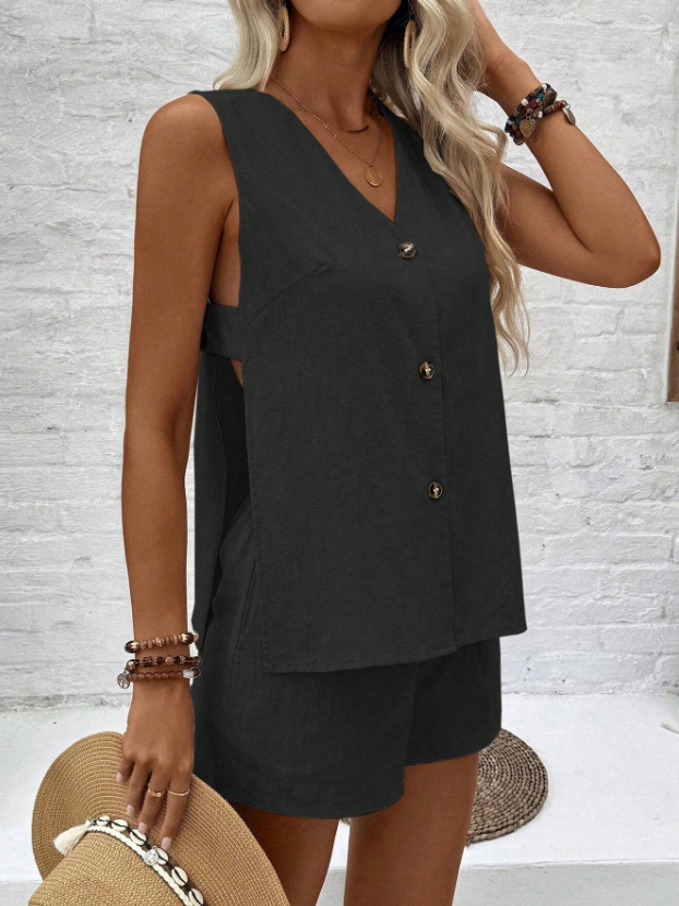 Collar: V-neckStyle: CasualColor: Military Green, BlackPants length: shortTop Sleeve Length: SleevelessPants and top material: cotton
