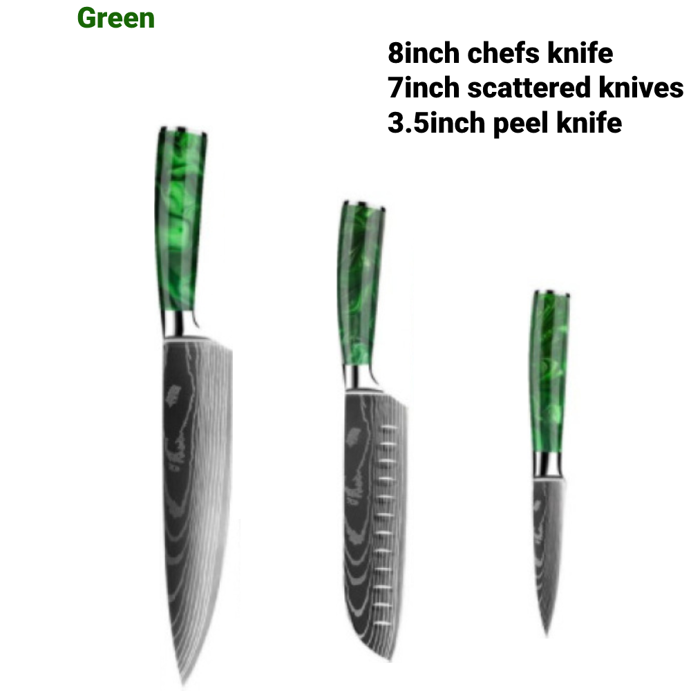 Specifications: 8-inch chef's knife (blue handle, red handle, green handle), 8-inch meat cleaver (blue handle, red handle, green handle, 8-inch noodle knife (blue handle, red handle, green handle, 7.5-inch knife with blue handle, red handle) Green handle, 7-inch small kitchen knife (blue handle, red handle, green handle, 7-inch Santoku knife (blue handle, red handle, green handle, 6-inch boning knife (blue handle, red handle, green handle), 5-inch universal knife (blue handle, red handle) Green handle, 5 inch Santoku knife (blue handle, red handle and green handle, 3.5 inch peel knife