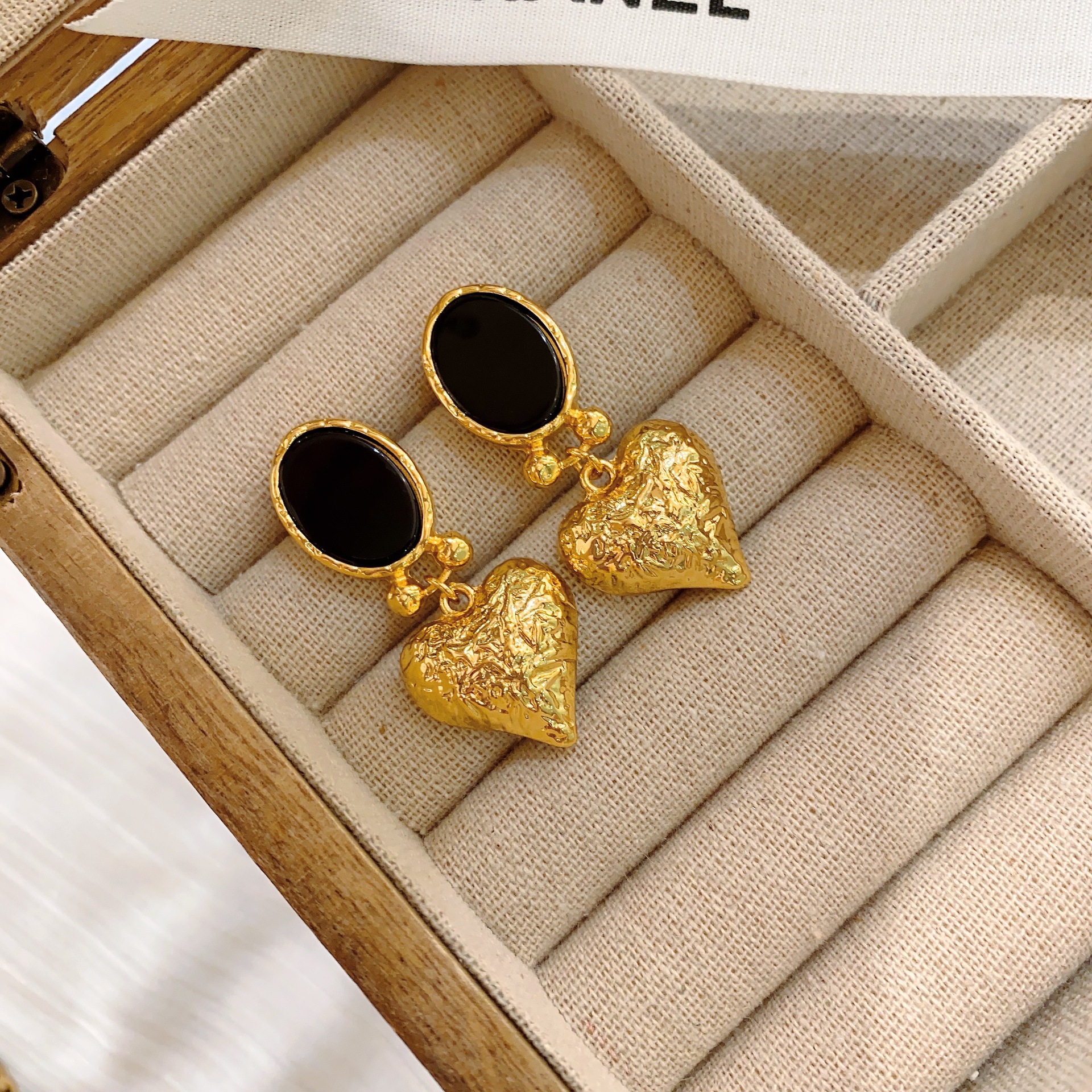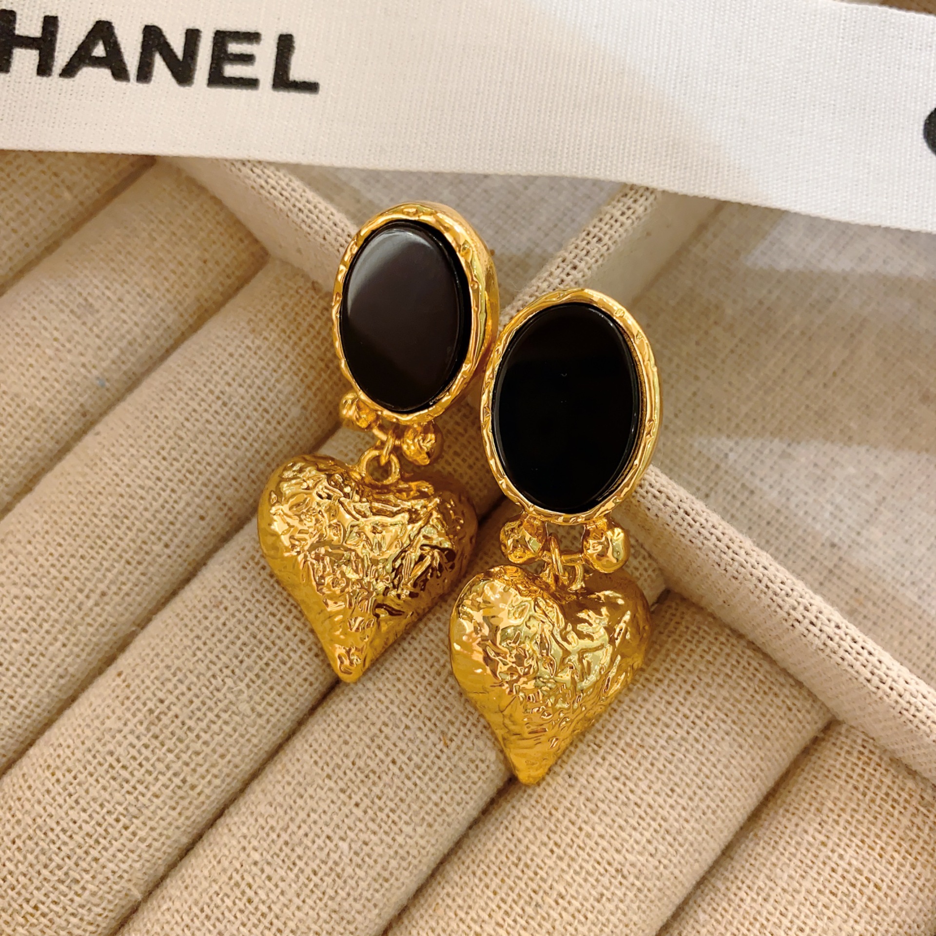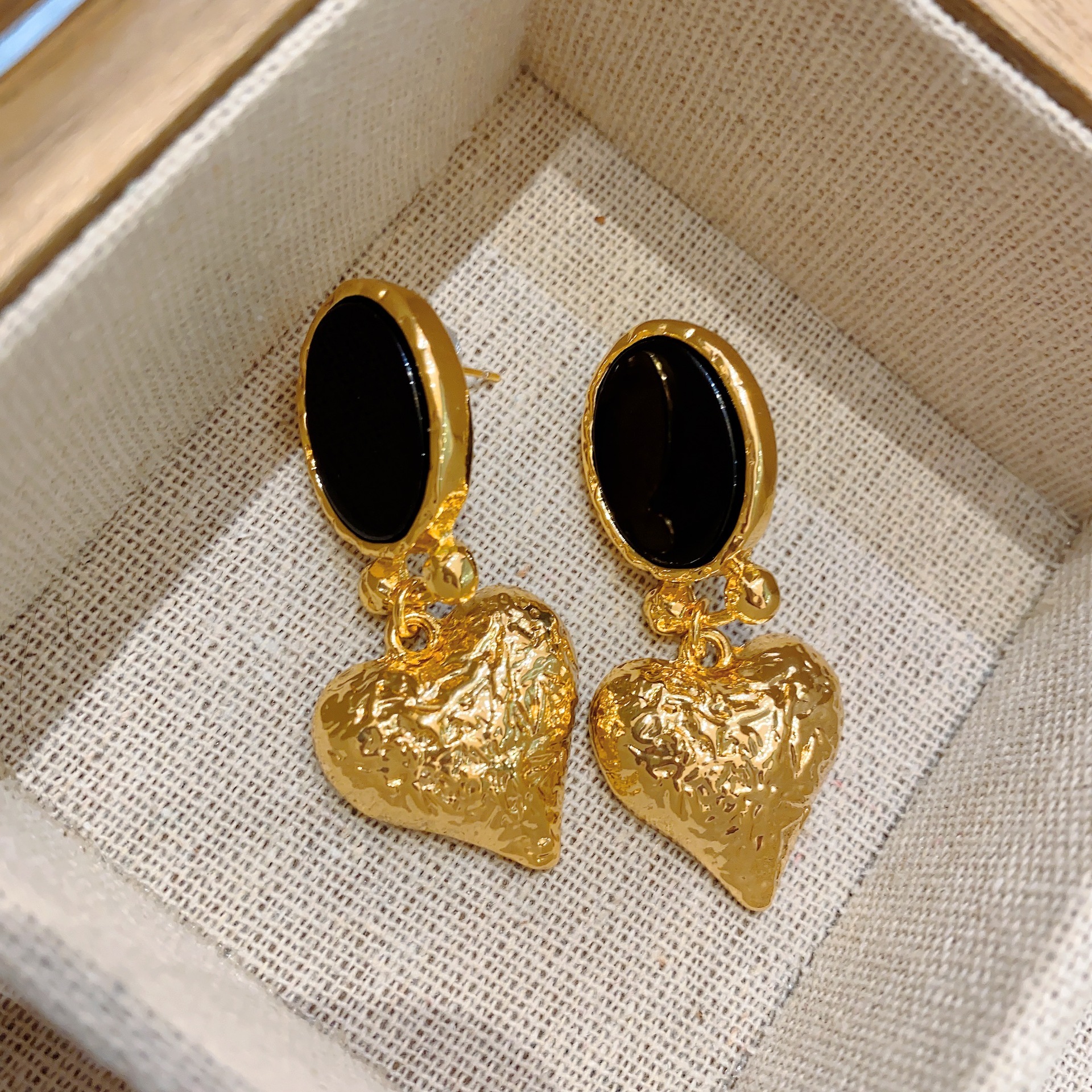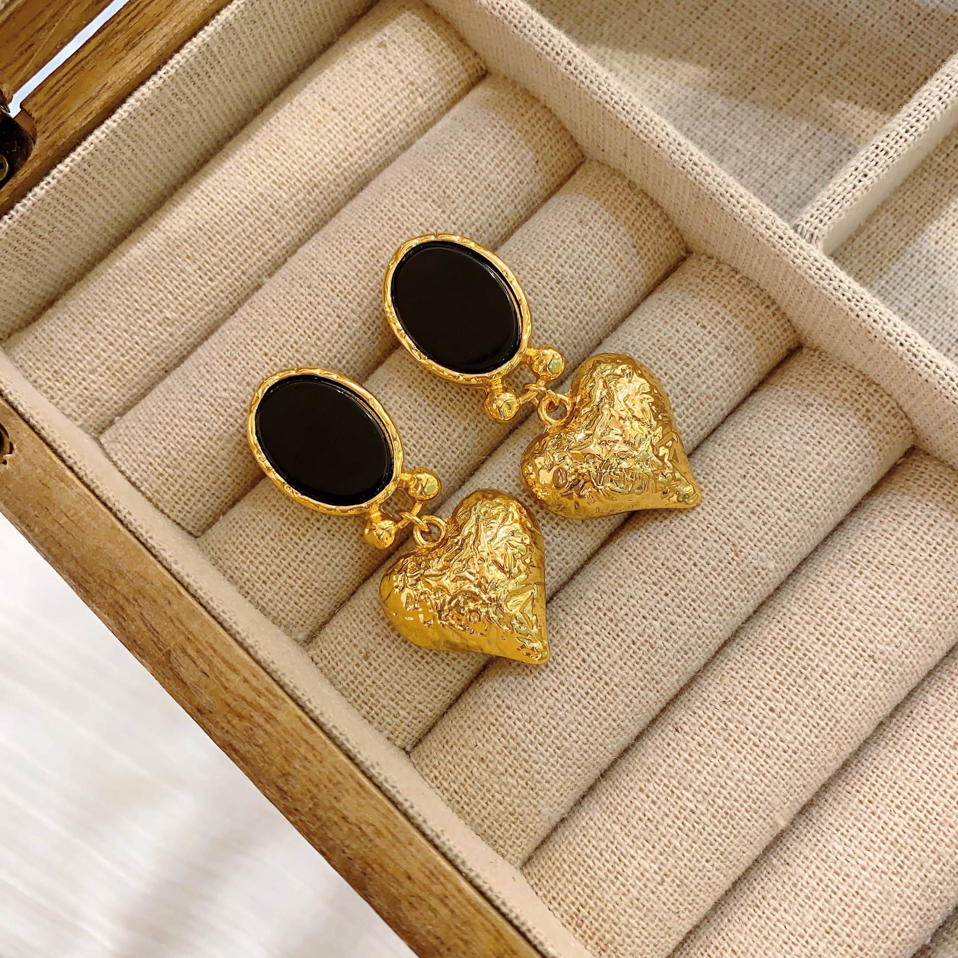 Vintage Inlaid Black Agate Ear Clip Heart-shaped Earrings