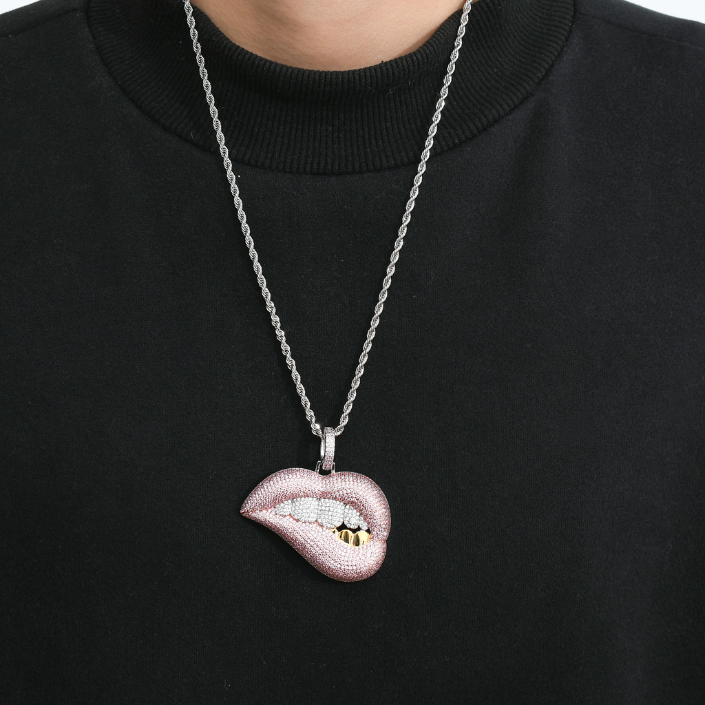 Sexy Lip Biting Hip Hop Pendant With Pink Zircon