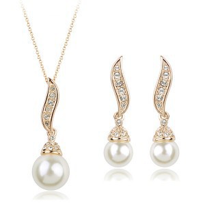 Material: alloy, electroplated white K/KC gold, imported rhinestone, imitation pearlEarring size: about: 3.1cmWidth: 0.9cmNecklace size: height: about 3.6cmWidth: 1.2cm Chain length: 40cm+5cm