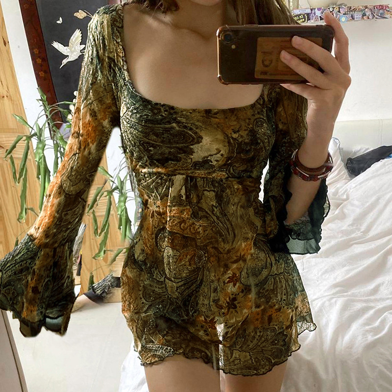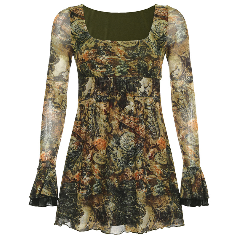 Product information: Pattern: vintage printing Color: green Size: S,M,L Style type: artistic retro Popular elements: contrast color Style: Basic Fabric name: Mesh Main fabric composition: Polyester Style: retro style Craft: Printing
