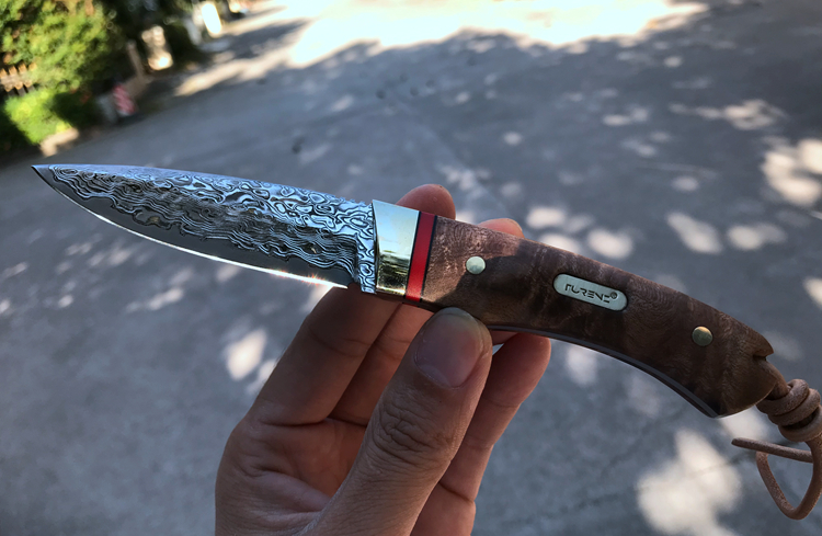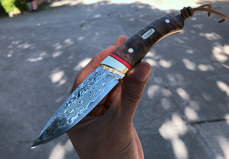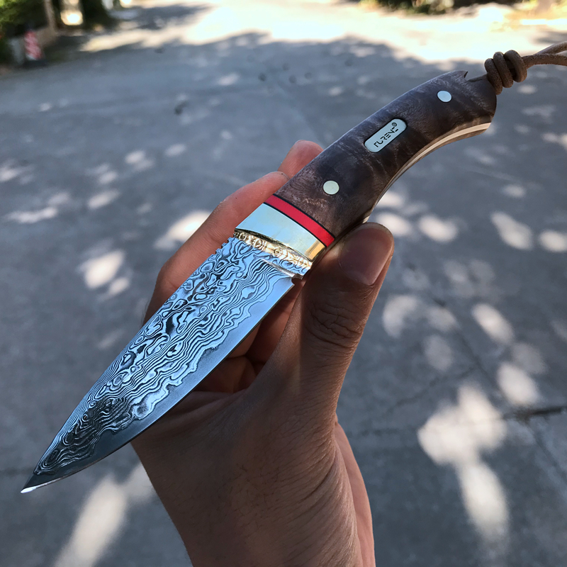 Total length: 18.5CM/blade length: 8.5CM, blade thickness: 3MM. Blade width: 2.8CM, weight: 92G, hardness: 60-61HRC safe and firm, surface effect: polishing technology, handle material: white shadow wood tree burl + red G10 pieces + pure brass, leather: Argentina carved plant tanned leather, pure hand dyeing and coloring hand-stitched carved/retro technology, packaging: manual box packaging