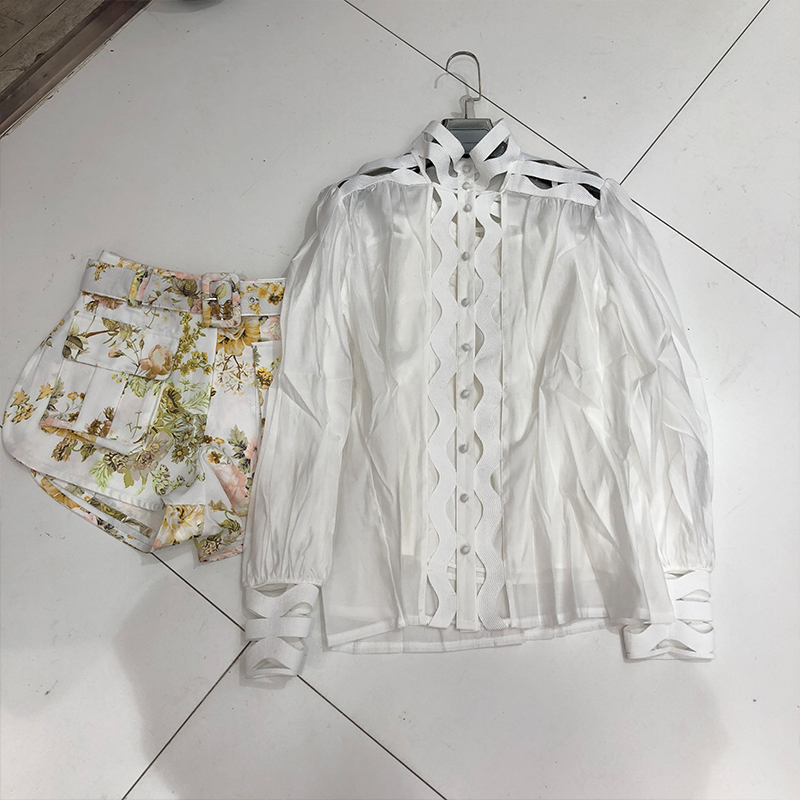 Model: Hollow long-sleeved shirt + printed suit shorts