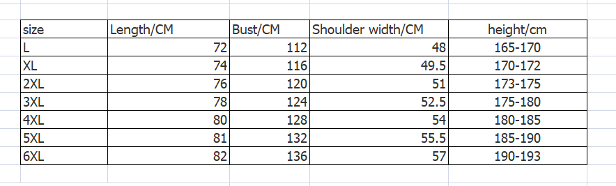 Size: L, XL, XXL, XXXL, XXXXL, 5XL, 6XL