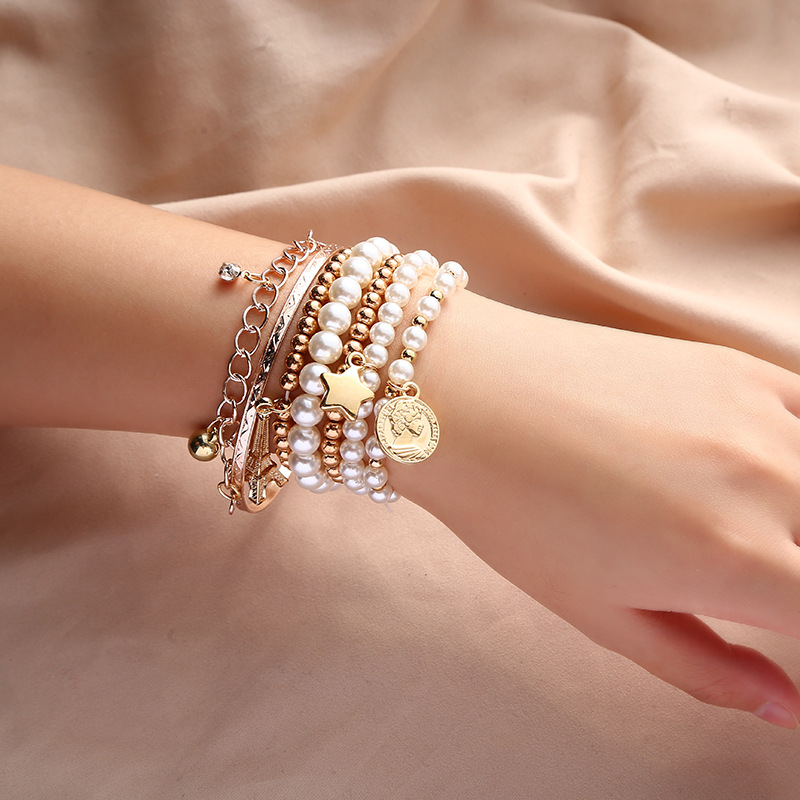 1. European and American fashion soft rhinestone Eiffel Tower logo retro pearl coin six-piece jewelry multi-layer elastic gold bracelet.