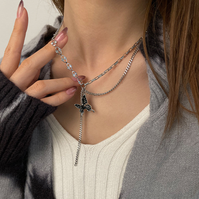 Product information:Color: Black Butterfly tassel necklaceApplicable people: womenPendant material: AlloyChain style: Box chainMaterial: titanium steelShape: Bow, animal/ZodiacPopular elements: ButterflyStyle: sweet and cool