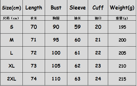 Size: S, M, L, XL, XXL Unit: cm