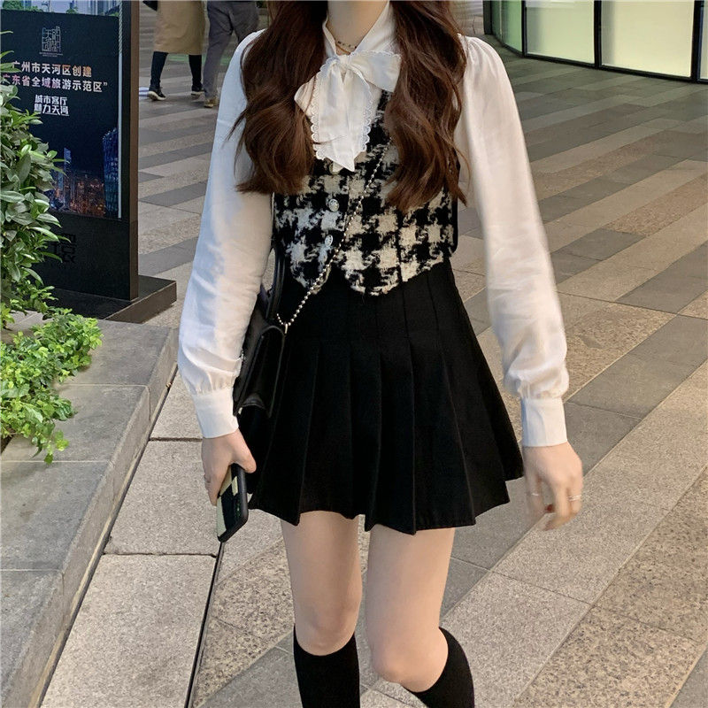 C: Shirt+vest+black pleated skirt