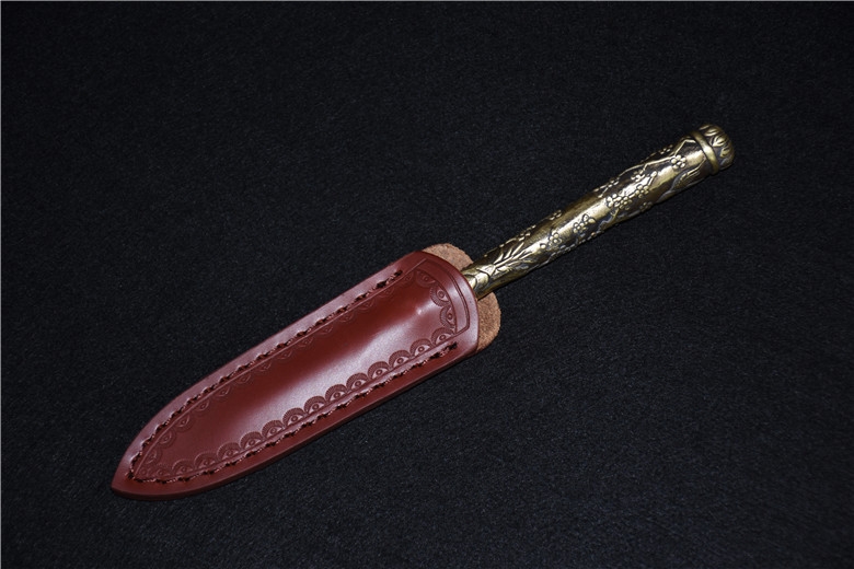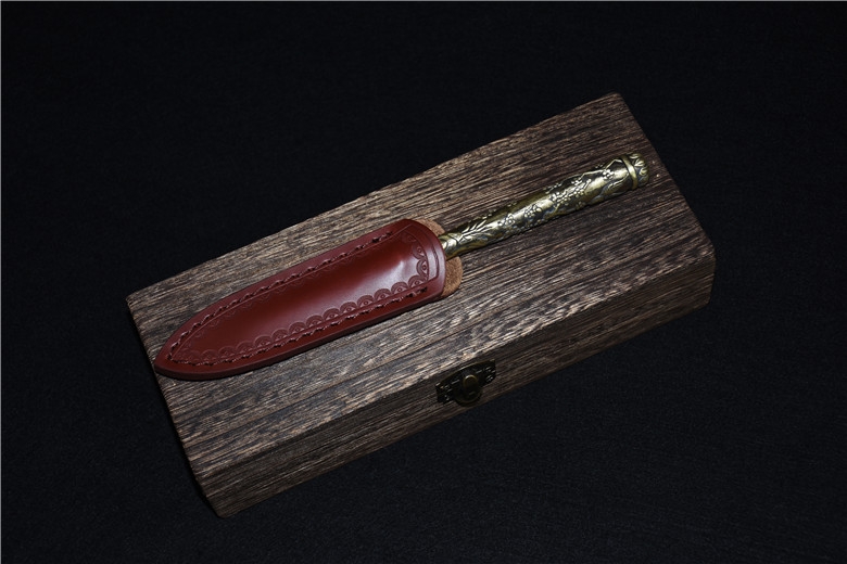 Full length: 192mmBlade length: 66mmBlade width: 14mmMaterial: one-piece pattern steel, copperPacking list: leather case, high-grade wooden box, knife