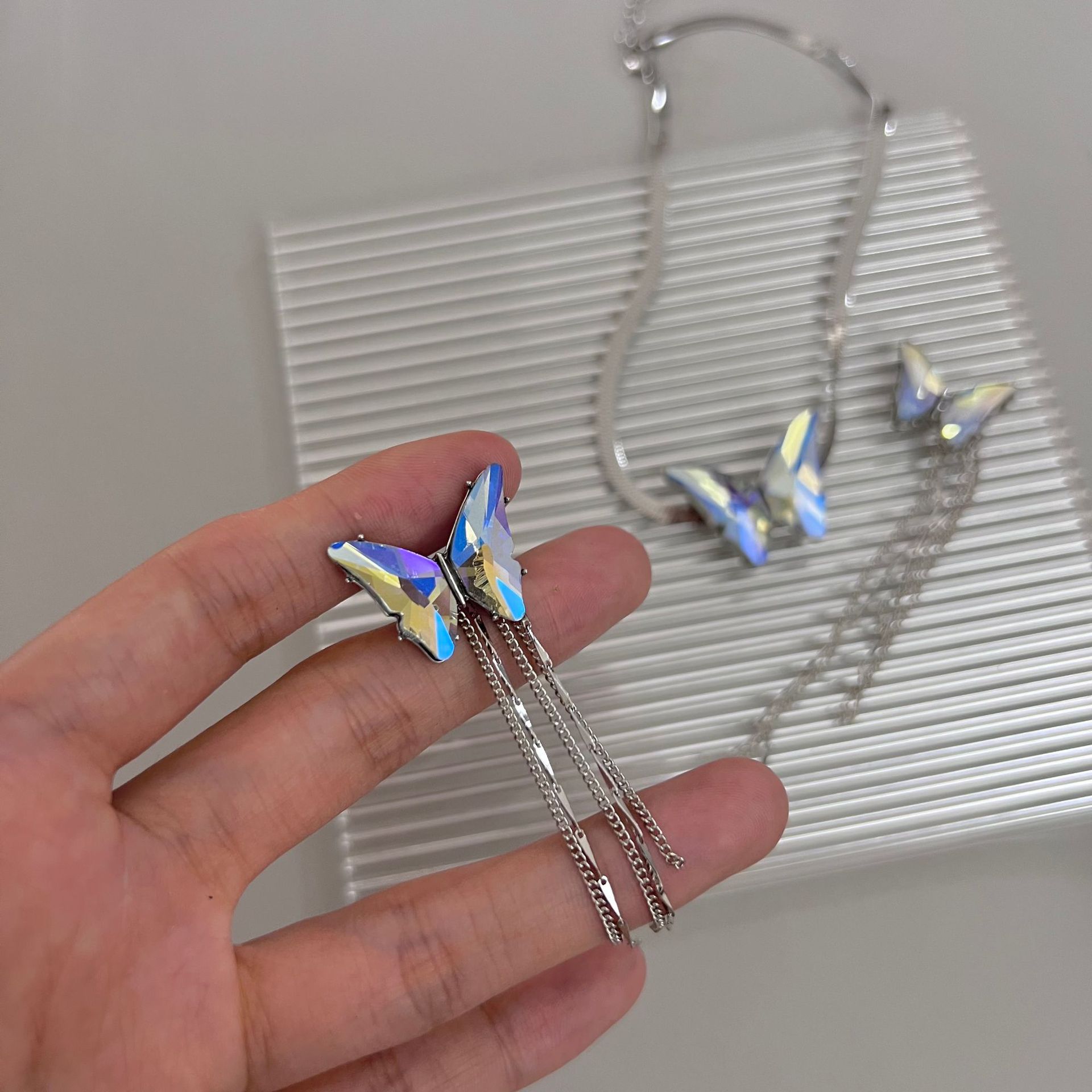Product information:Treatment Process: ElectroplatingColor: earrings, necklaceApplicable people: womenPendant material: artificial crystalChain style: snake bones chainMaterial: AlloyShape: BowPopular elements: ButterflyStyle: ins style