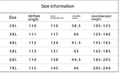 Size: 2XL recommended 52.50kg-62.50kg,3XL recommended 62.50kg-72.50kg,4XL recommended 72.50kg-82.50kg,5XL recommended 82.50kg-92.50kg,6XL recommended 92.50kg-102.50kg,7XL recommended 102.50kg-112.50kg
