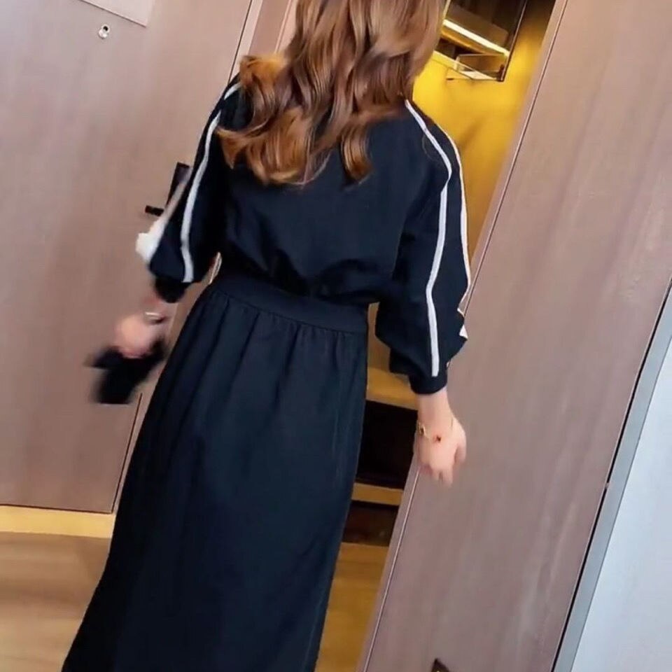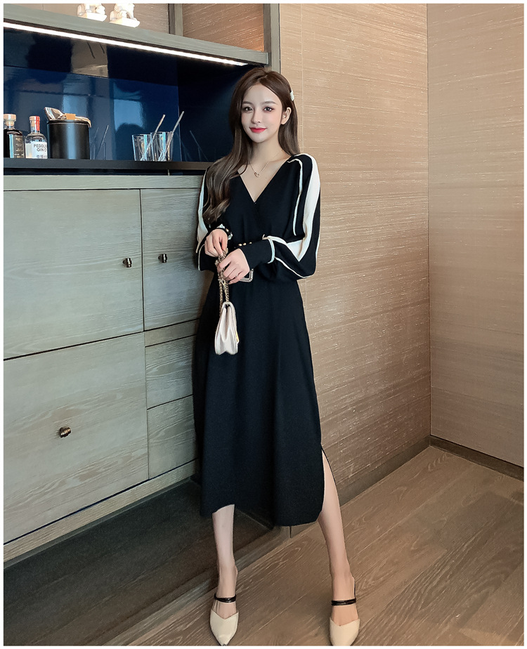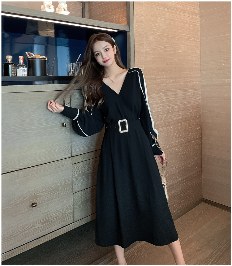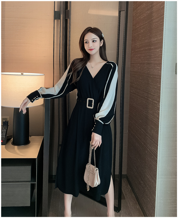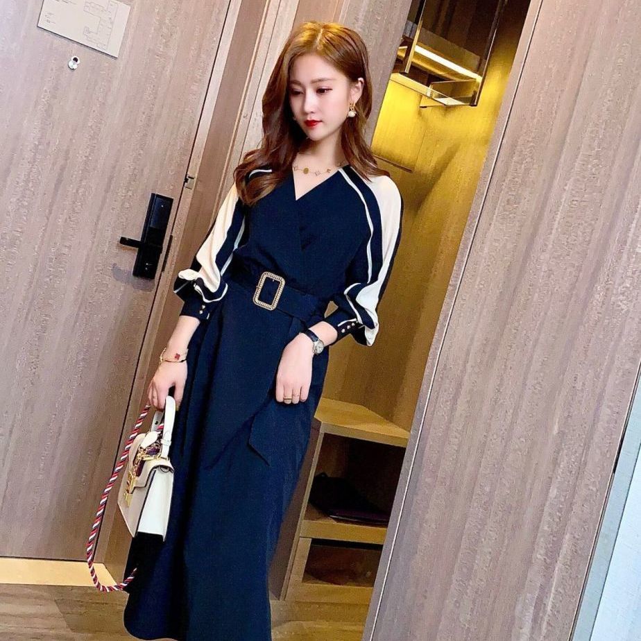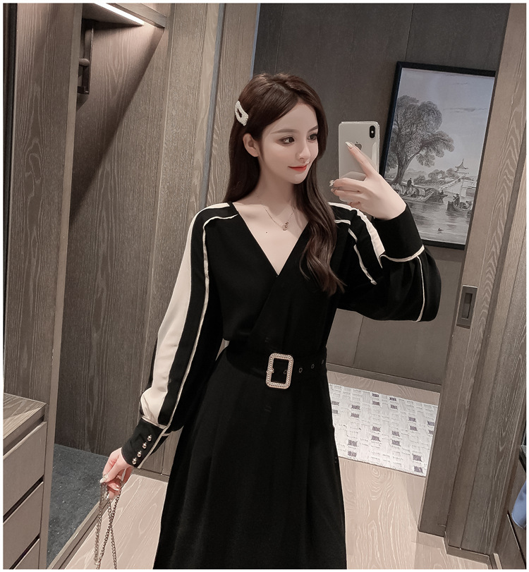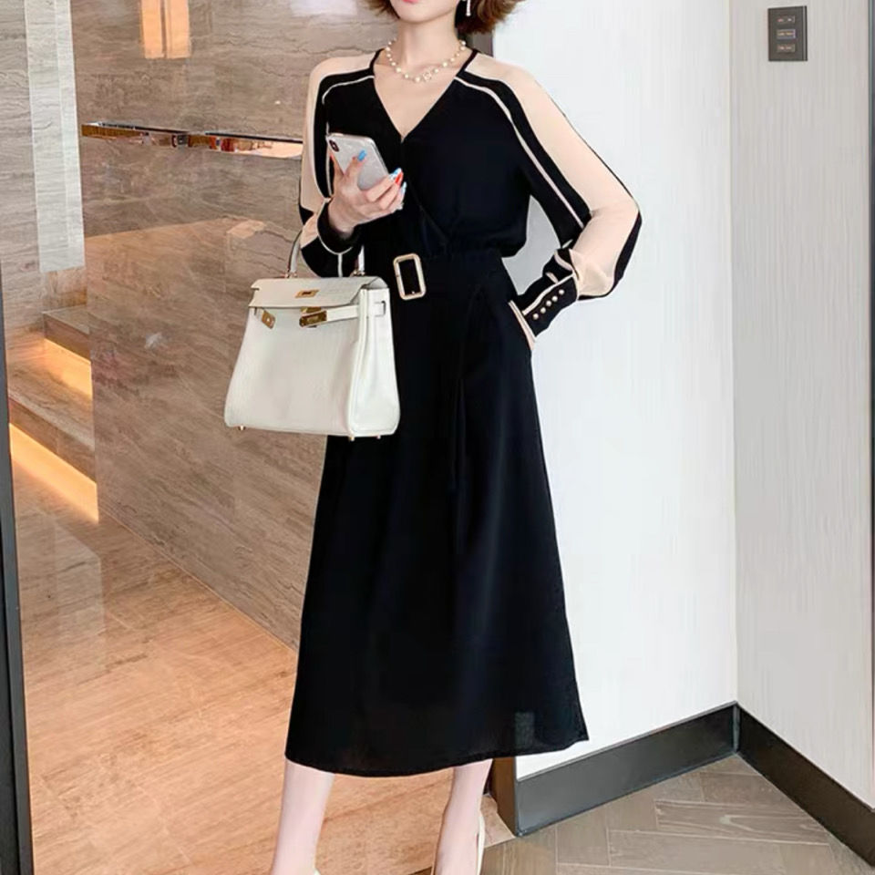 Temperament V-neck, contrast stitching belt, waist shirt, cuffs, buckle embellished mid-length version