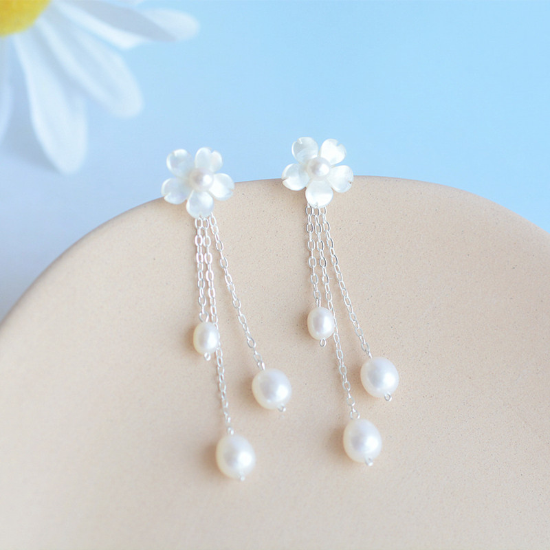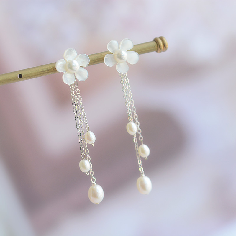 Product information:Material: Silver jewelryMetal material: 925 silverPattern: Plant flowersColor classification: White butterfly shell cherry blossom earrings+pearl tasselsSize Information: The height of the earrings is about 6 centimeters