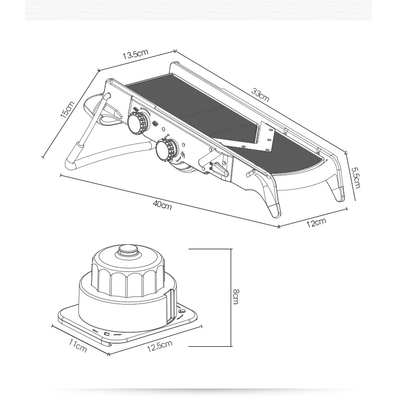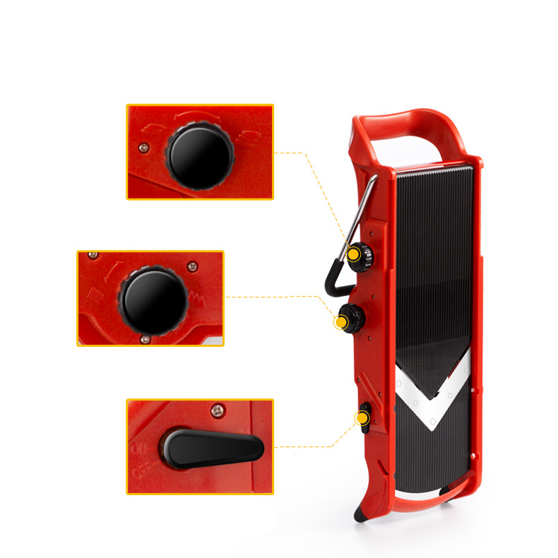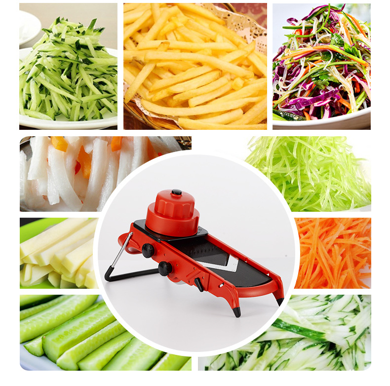 Product name: Multifunctional vegetable cutterBody material: high quality ABSBlade material: SUS420J2 stainless steelProduct combination: blade + hand guard + guide grooveMain functions: slicing, grating, cutting, dicing
