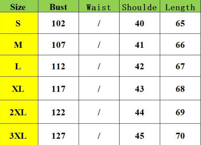Size:S,M,L,XL,2XL,3XL unit:cm