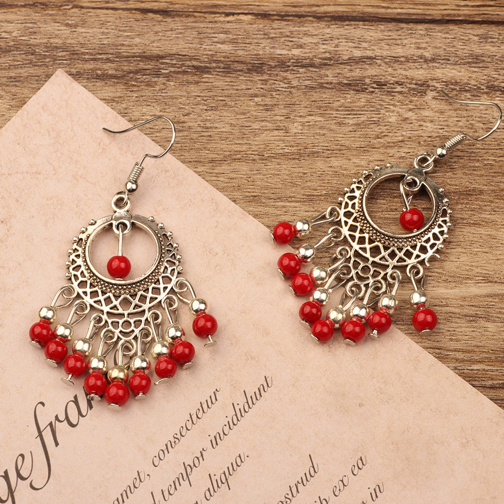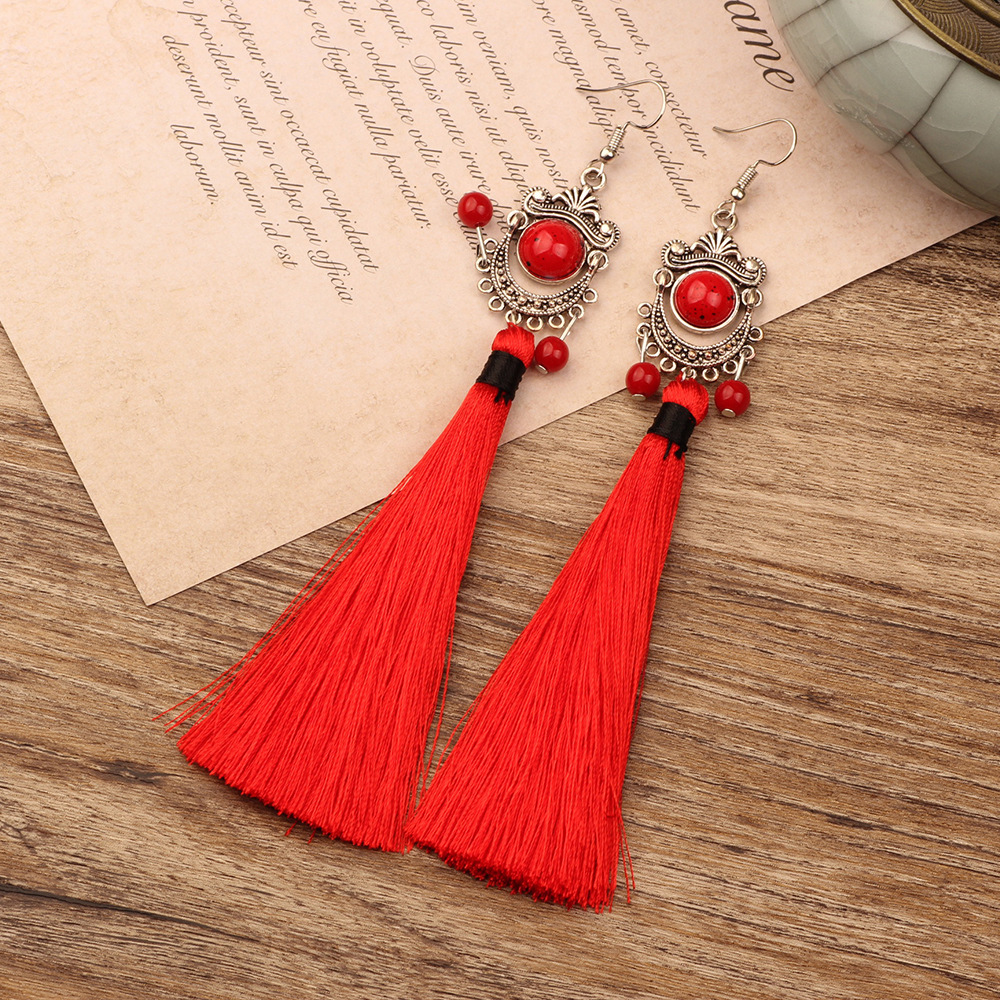 Color: blue tassel ring, red tassel earrings, black tassel earrings, blue beads, black beads, red beads, red small bead, turquoise water drop earrings