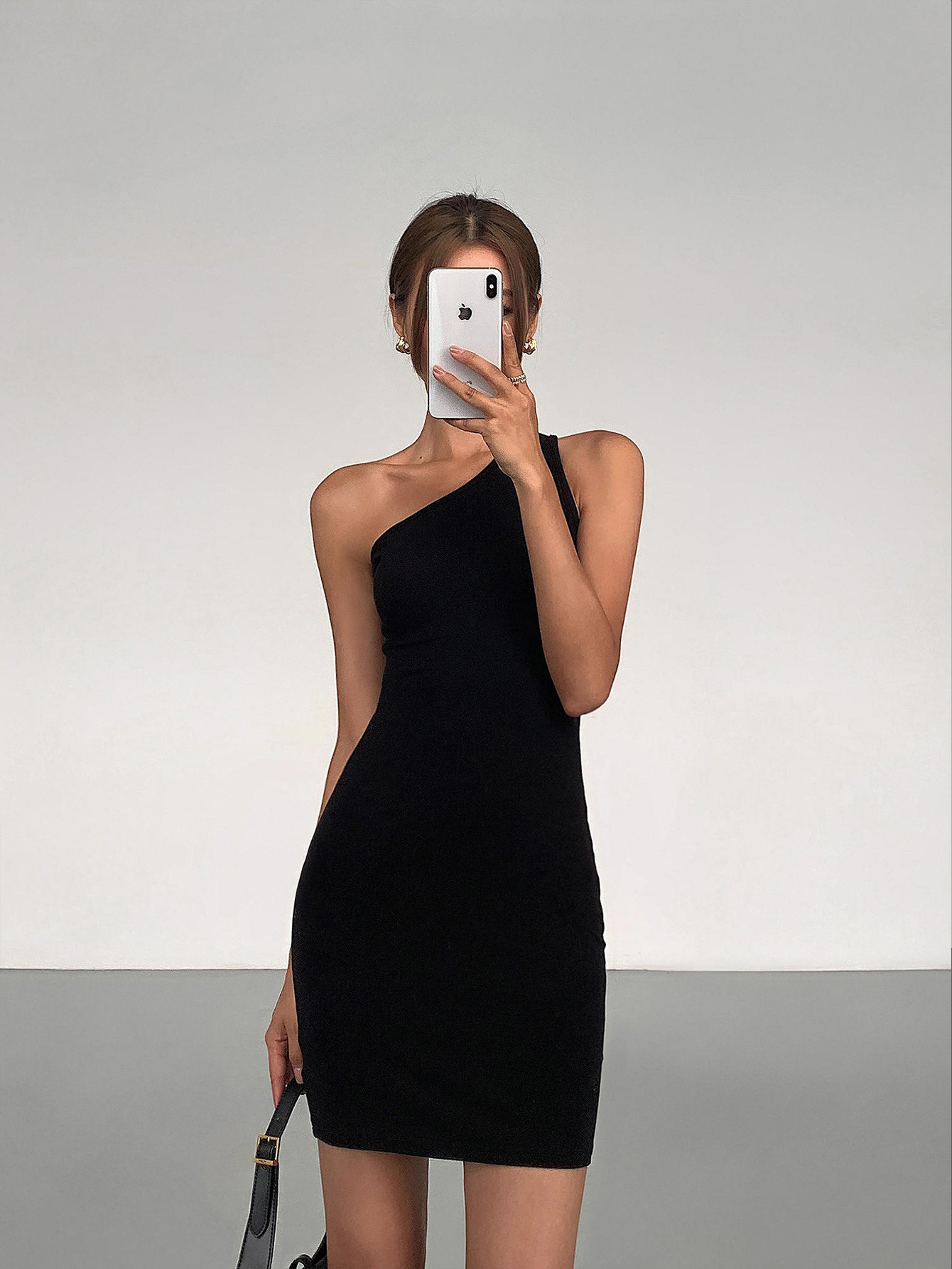 Product information: Skirt type: hip skirt Color: Black Size: S,M,L,XL Skirt length: short skirt Style: oblique shoulder style Main fabric composition: Cotton Skirt Category: Dress Style: Socialite style Craft: collage/stitching