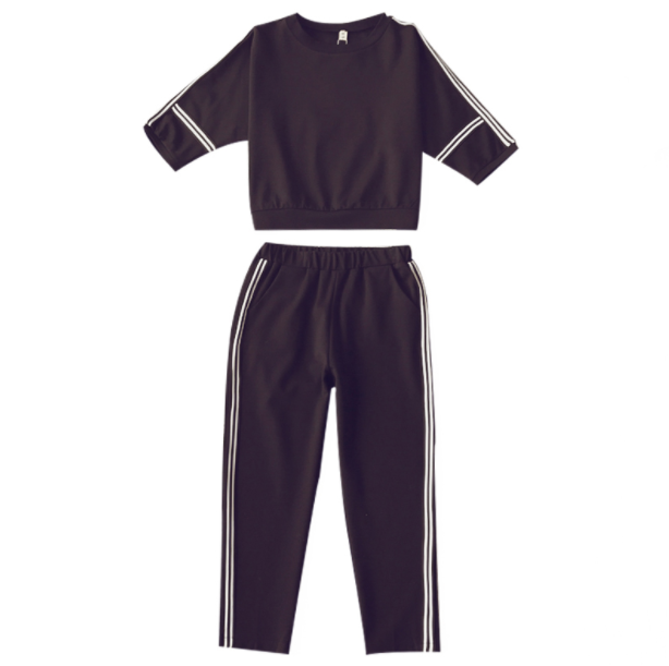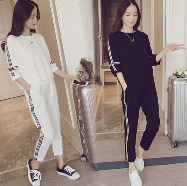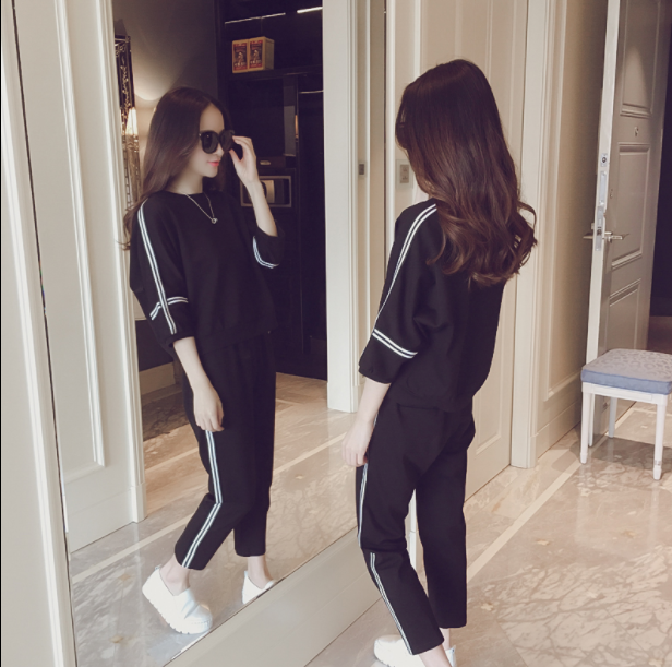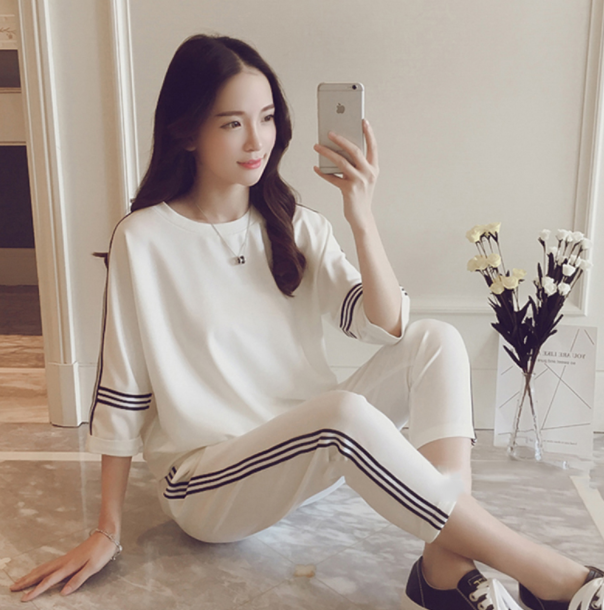 Korean version of the loose casual suit female summer sports clothes junior high school students side stripes short-sleeved cropped trousers two-piece