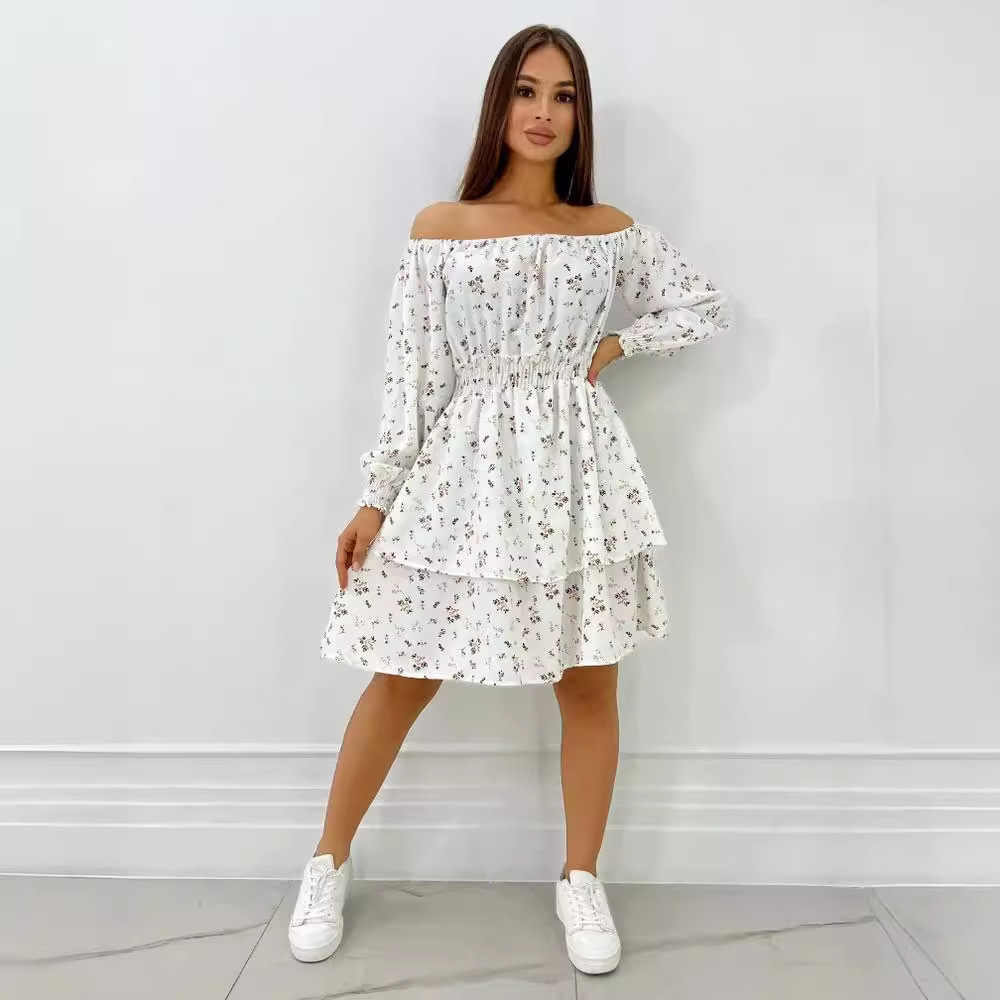 Popular elements: off-the-shoulder collar, tight waist, stretch, double layer, A- line skirt, long sleeve