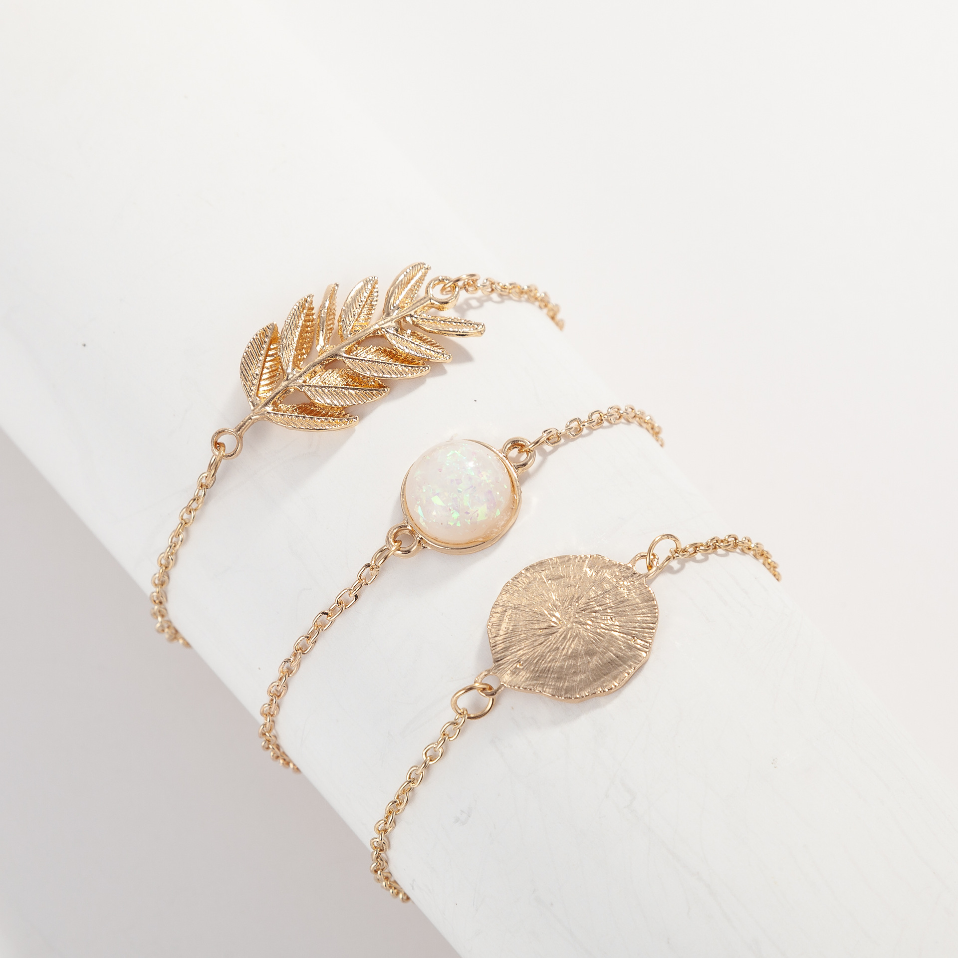 Material: Alloy Treatment process: electroplatingType: BraceletModeling: leavesPackaging: Individually packedProcessing customization: NoColor: Gold 3-piece setWhether the source of supply for cross-border export: Yes