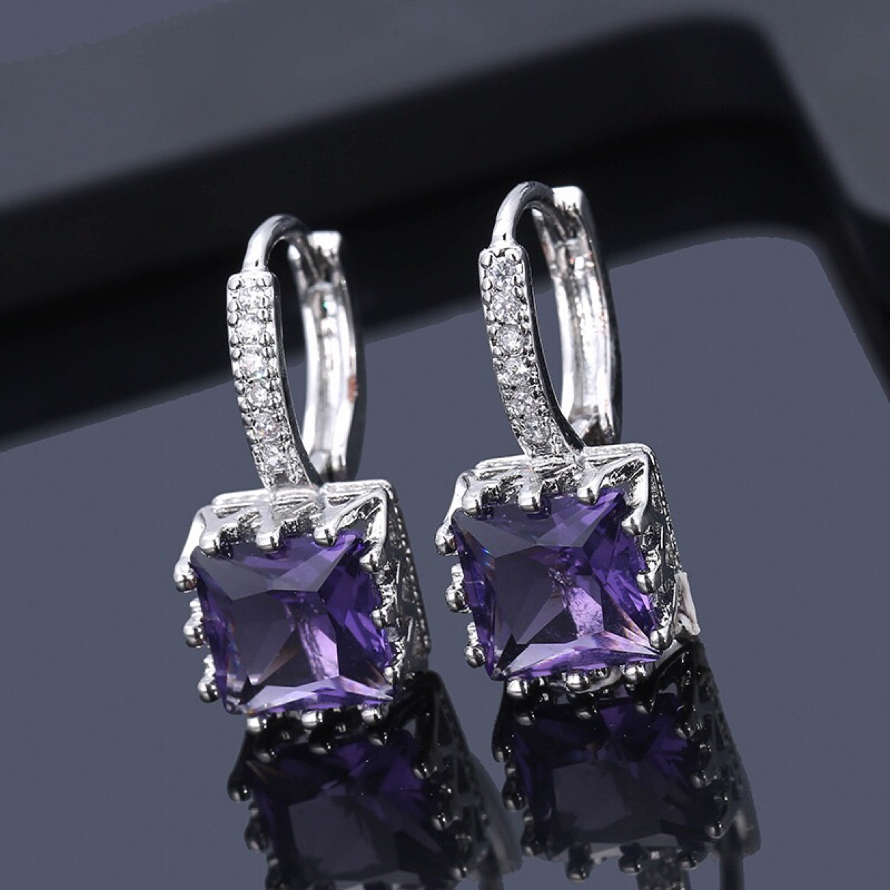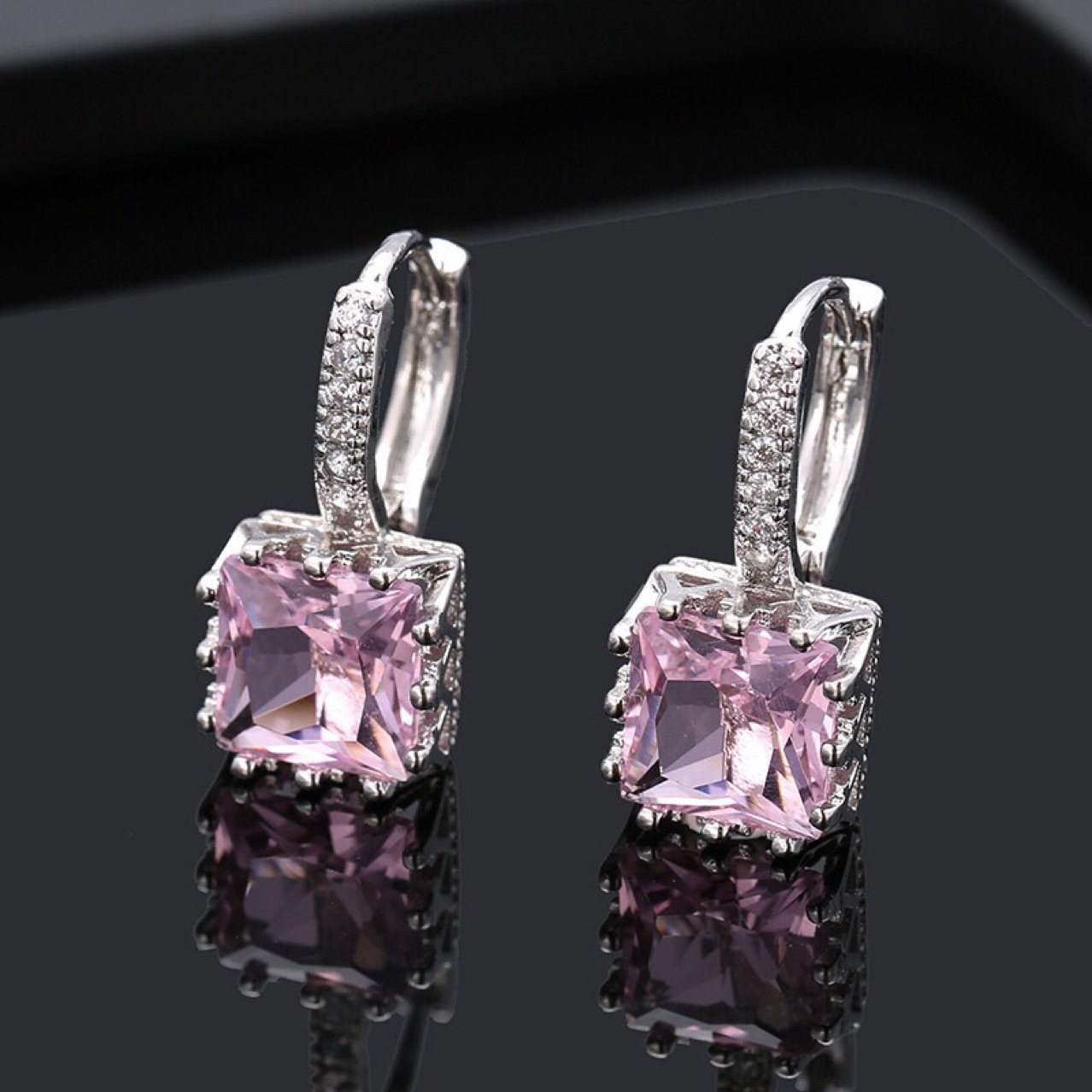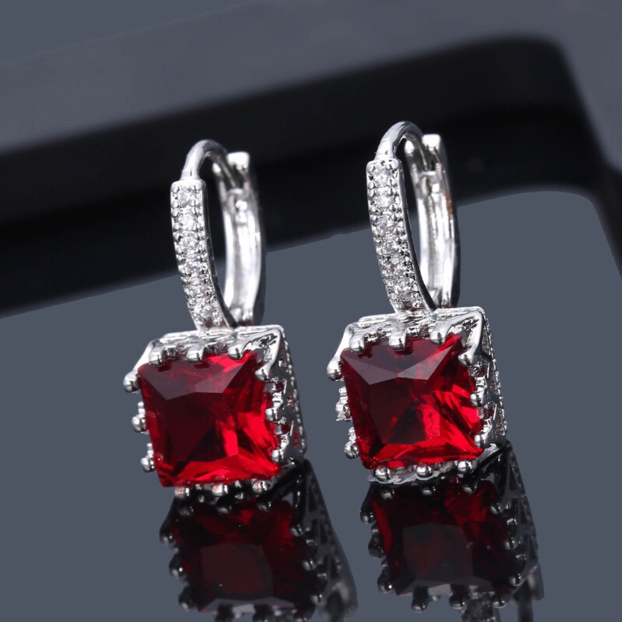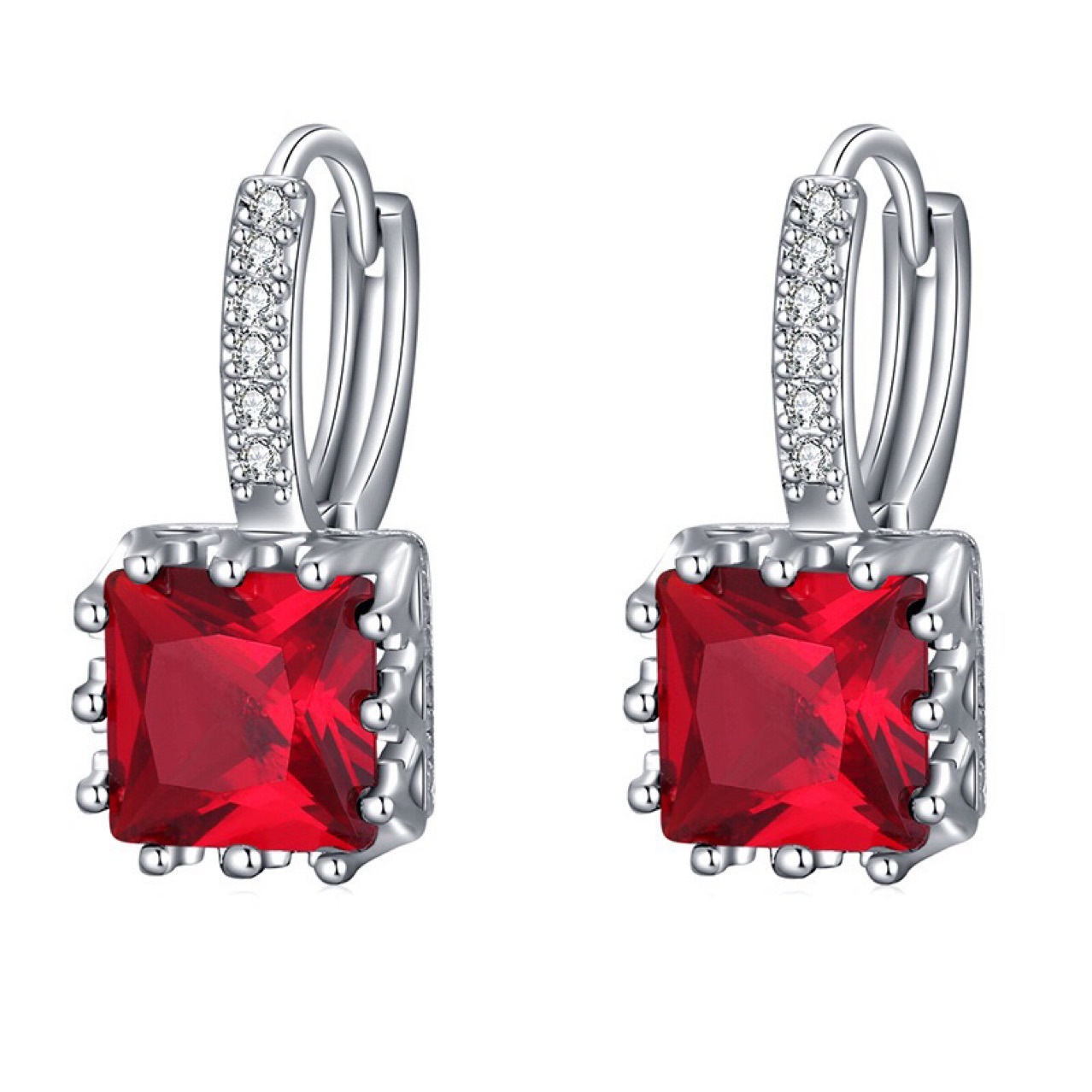 Product informationMaterial: CopperModeling: geometricTreatment process: zirconPackaging: Individually packedInlay material: gold-plated inlaid artificial gems/semi-precious stonesColor: white, red, purple, pinkPacking listEarrings*1
