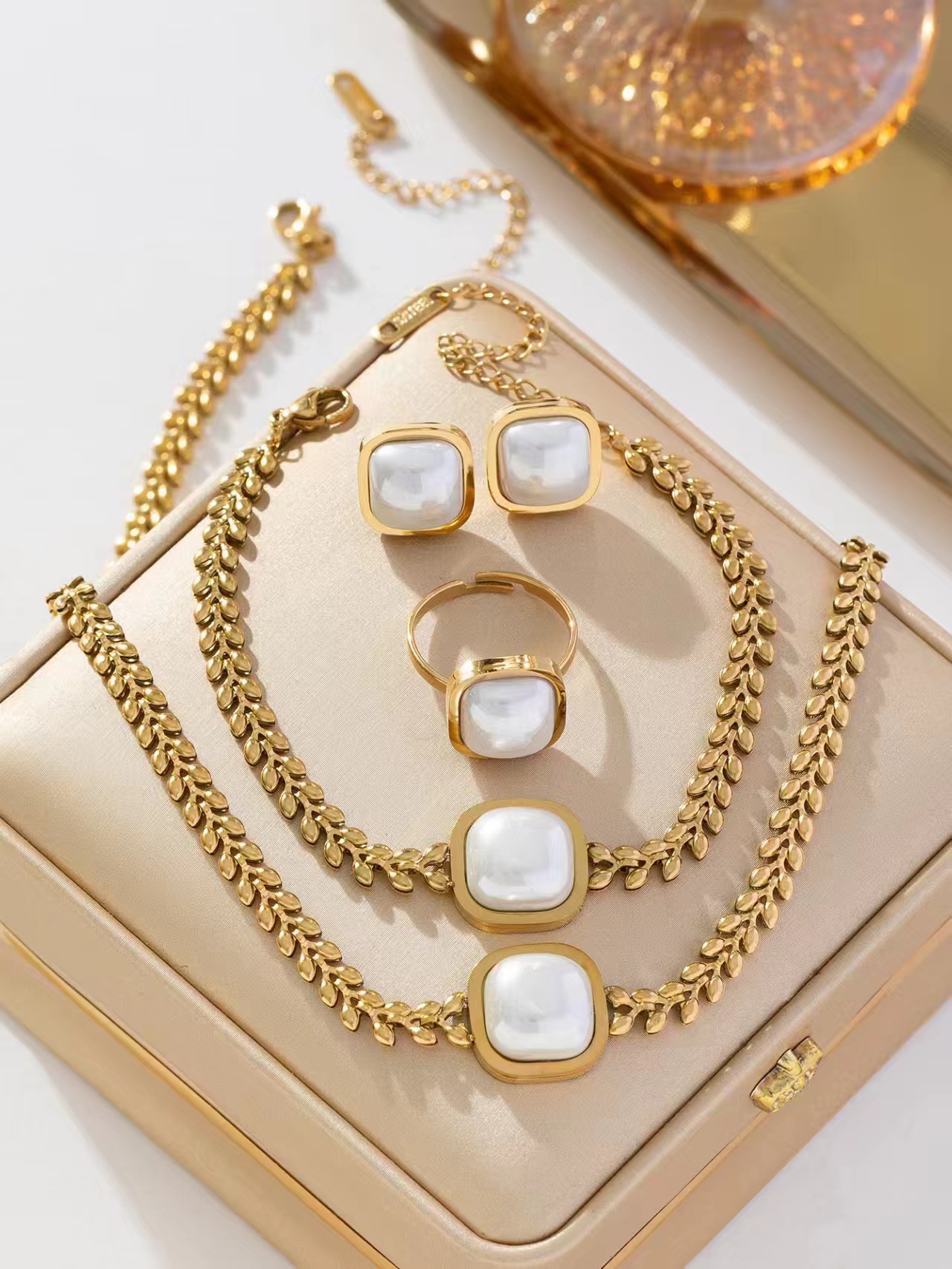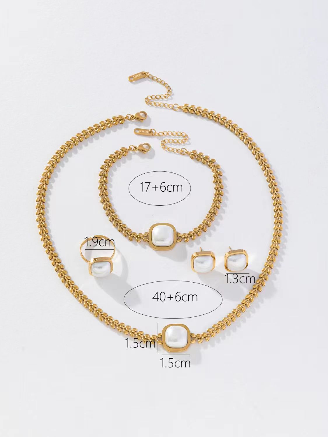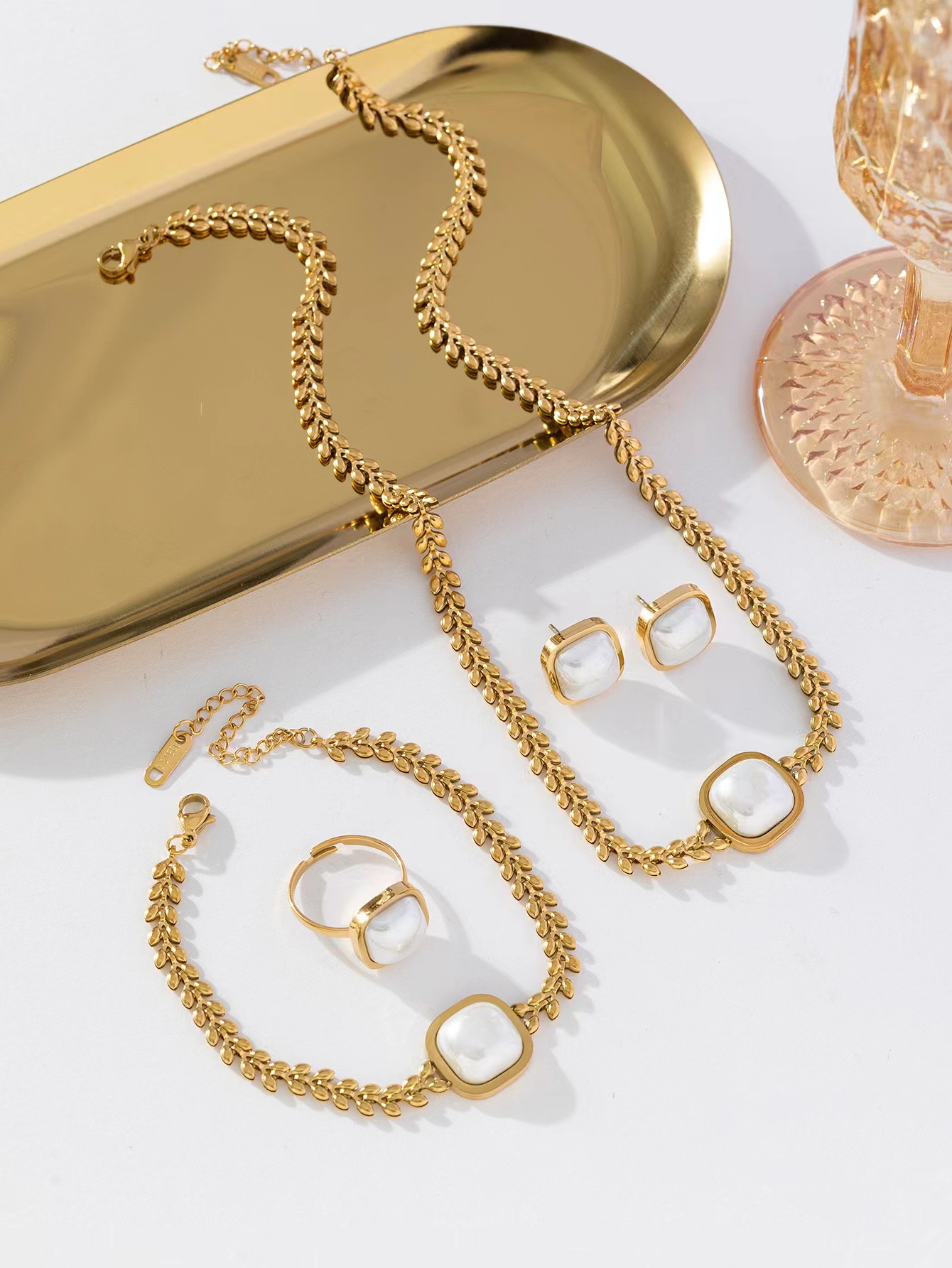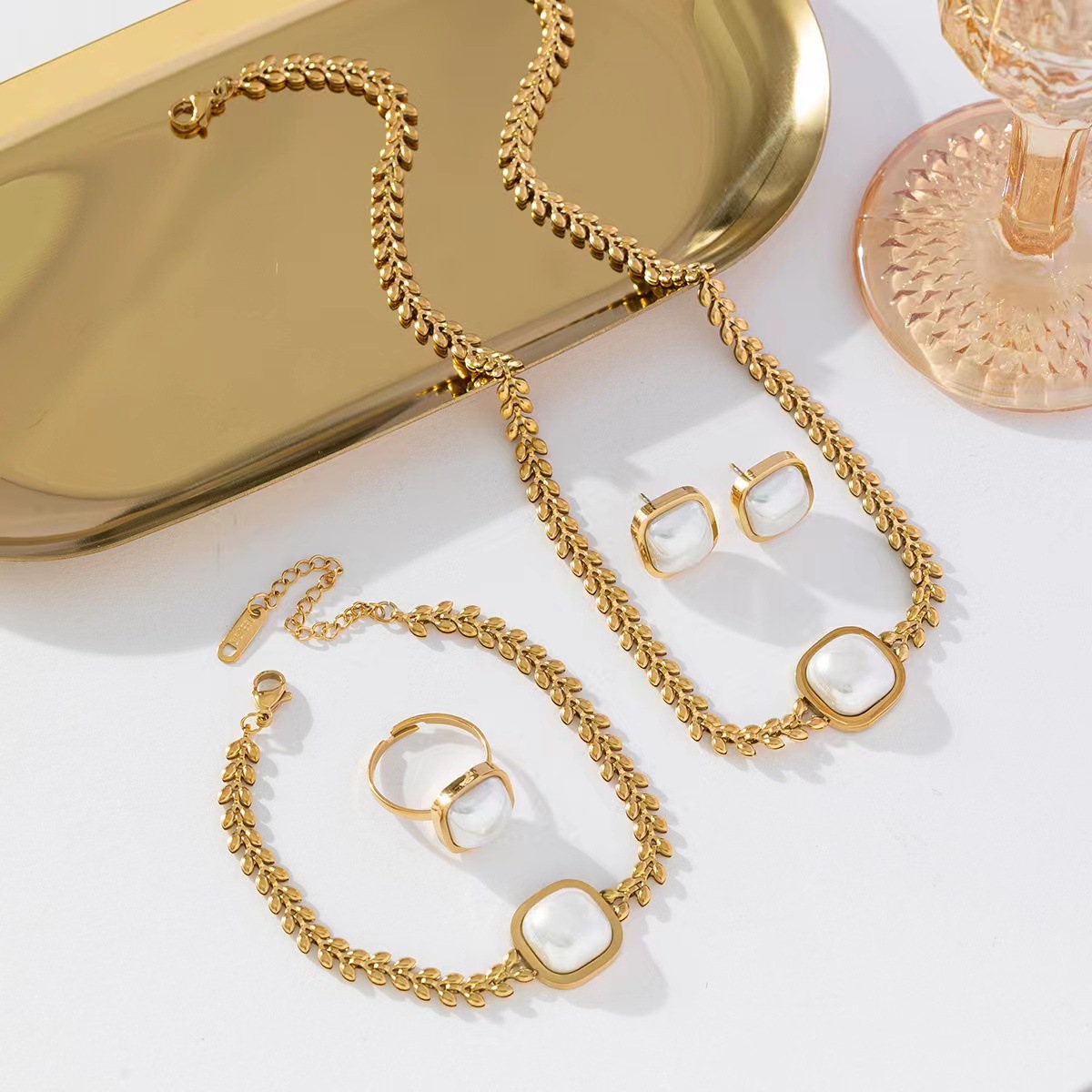 Color: wheat pearl necklace K430, wheat pearl bracelet K432, wheat pearl earrings K431, wheat pearl ring K433, pearl necklace bracelet earrings four-piece ring