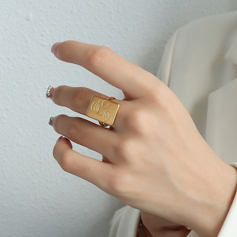 Product informationMaterial: titanium steelStyle: European and AmericanItem No.: A195Modeling: geometricTreatment process: electroplatingStyle: Women'sInlaid material: not inlaidColor: golden face ringSize: No. 7Popular elements: geometry