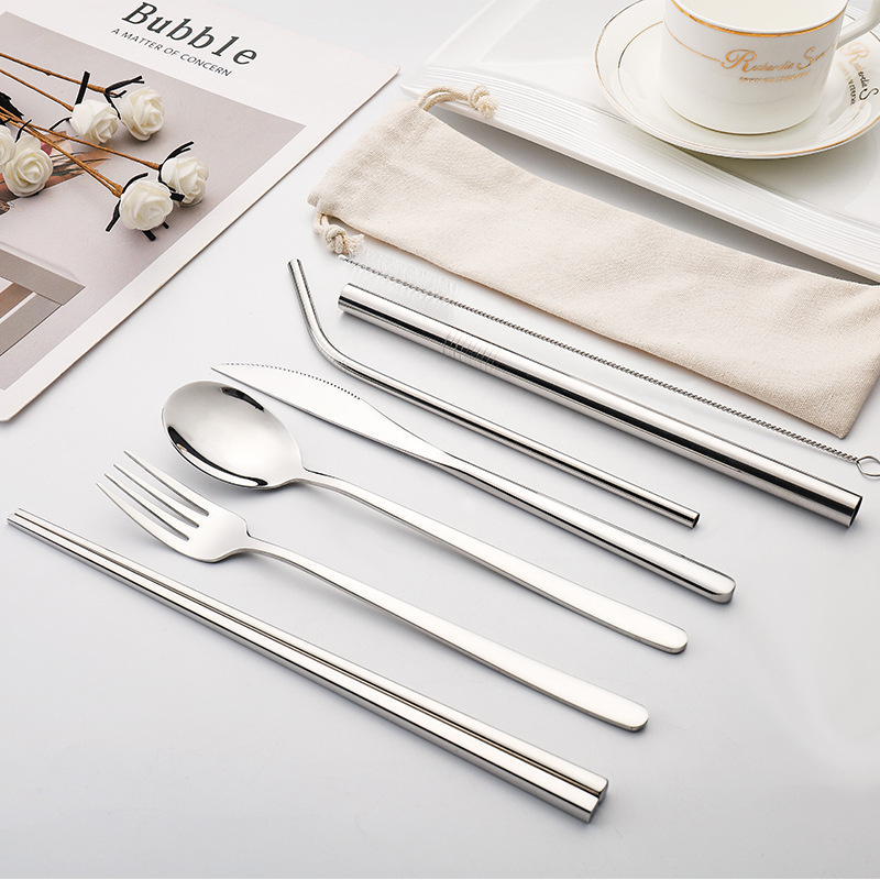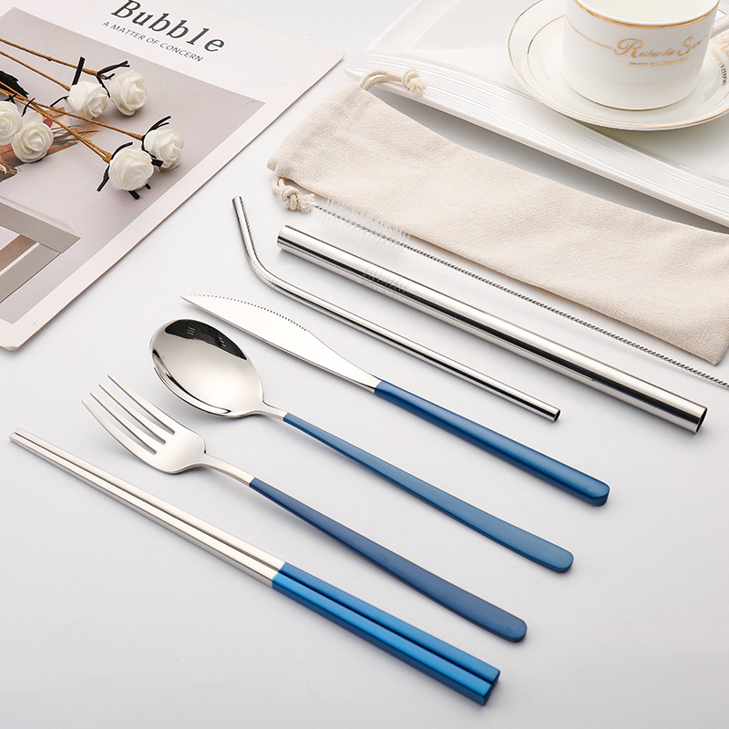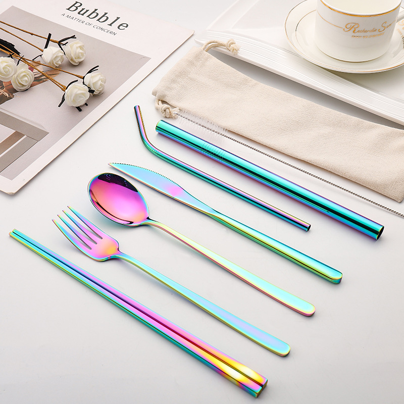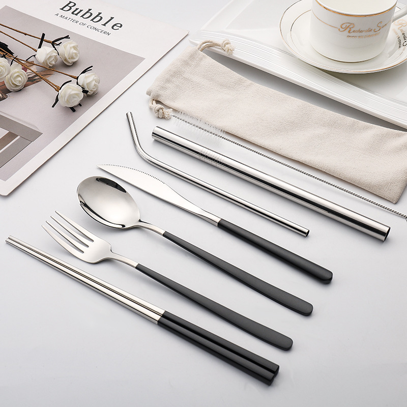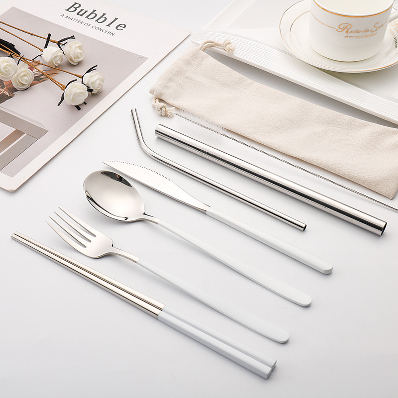Set list: knife, fork, spoon, chopsticks, straight straw, curved straw, brush, cloth bag, color box