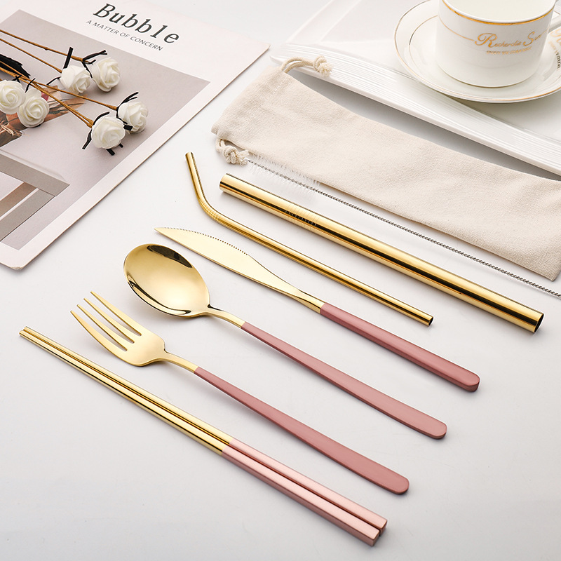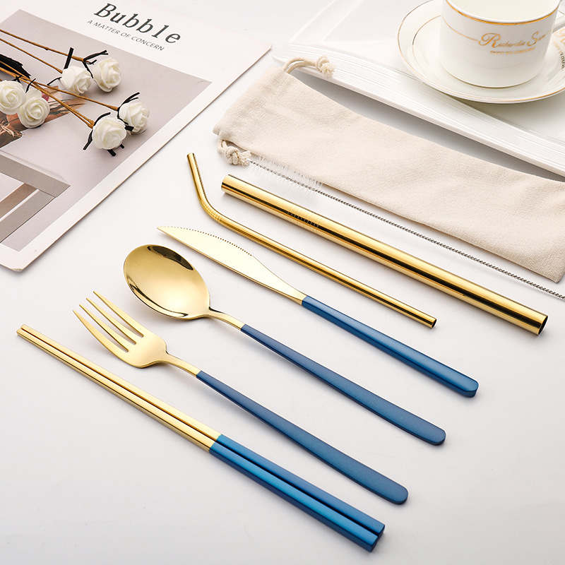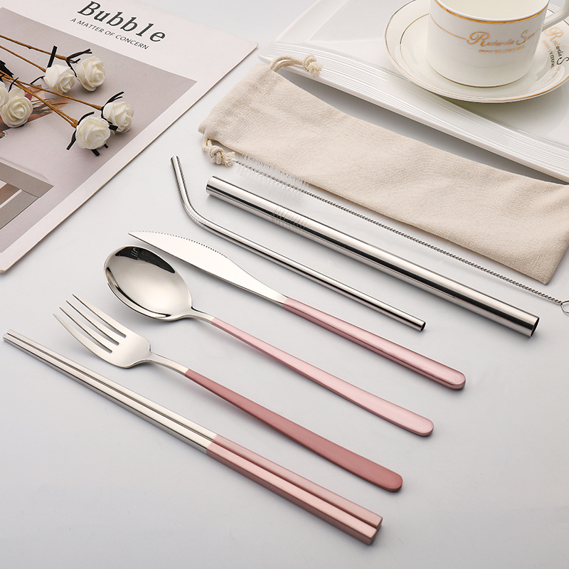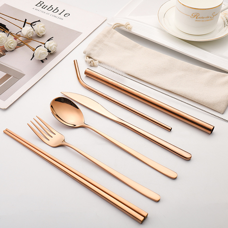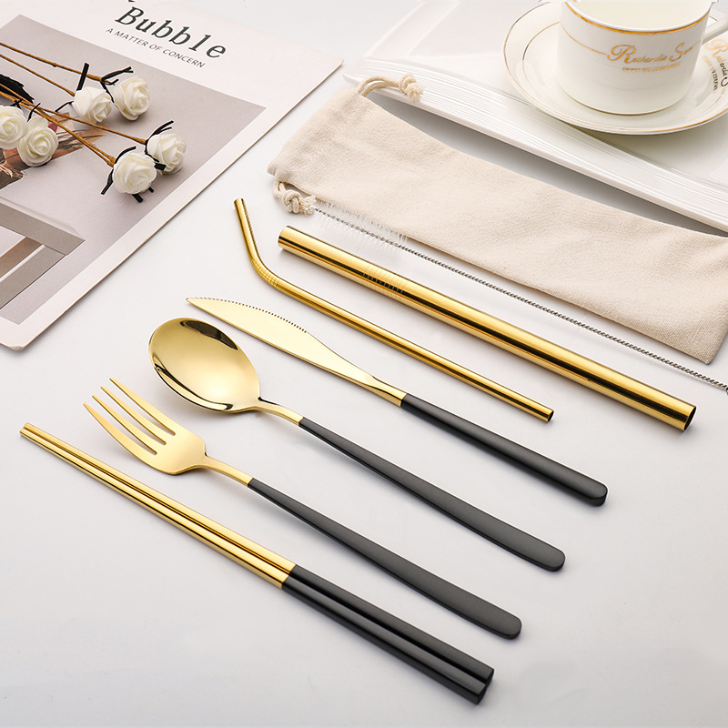 Set list: knife, fork, spoon, chopsticks, straight straw, curved straw, brush, cloth bag, color box