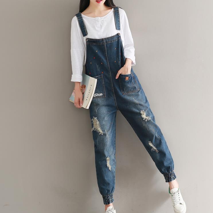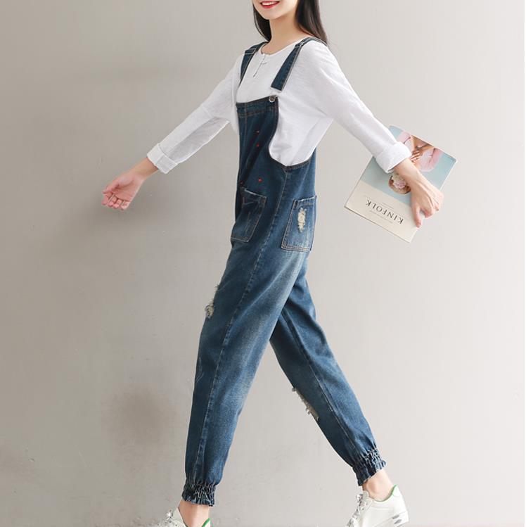 Literary retro loose large size embroidery hole denim bib