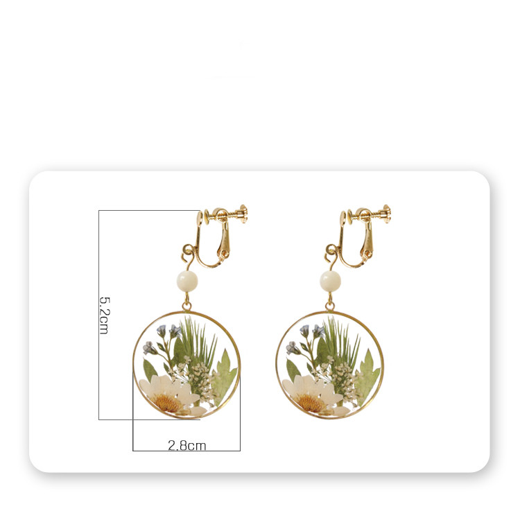 Product Information:Material: Copper gilt + dried flowerDesigns: plants and flowersStyle: OriginalColor: Ear hook, ear clipEar hook type: 5.8x2.8cmEar clip: 5.8x2.8cmPacking list:Earrings X1Pair