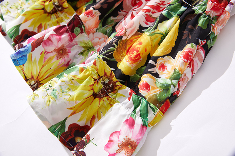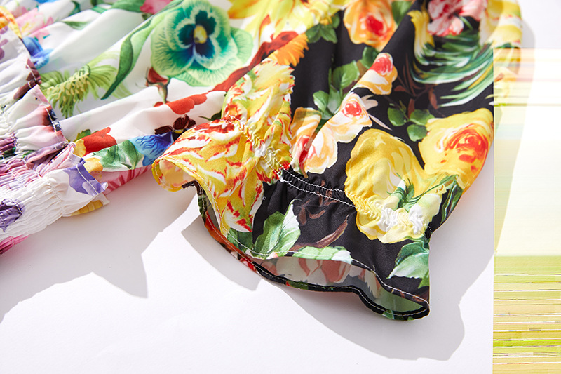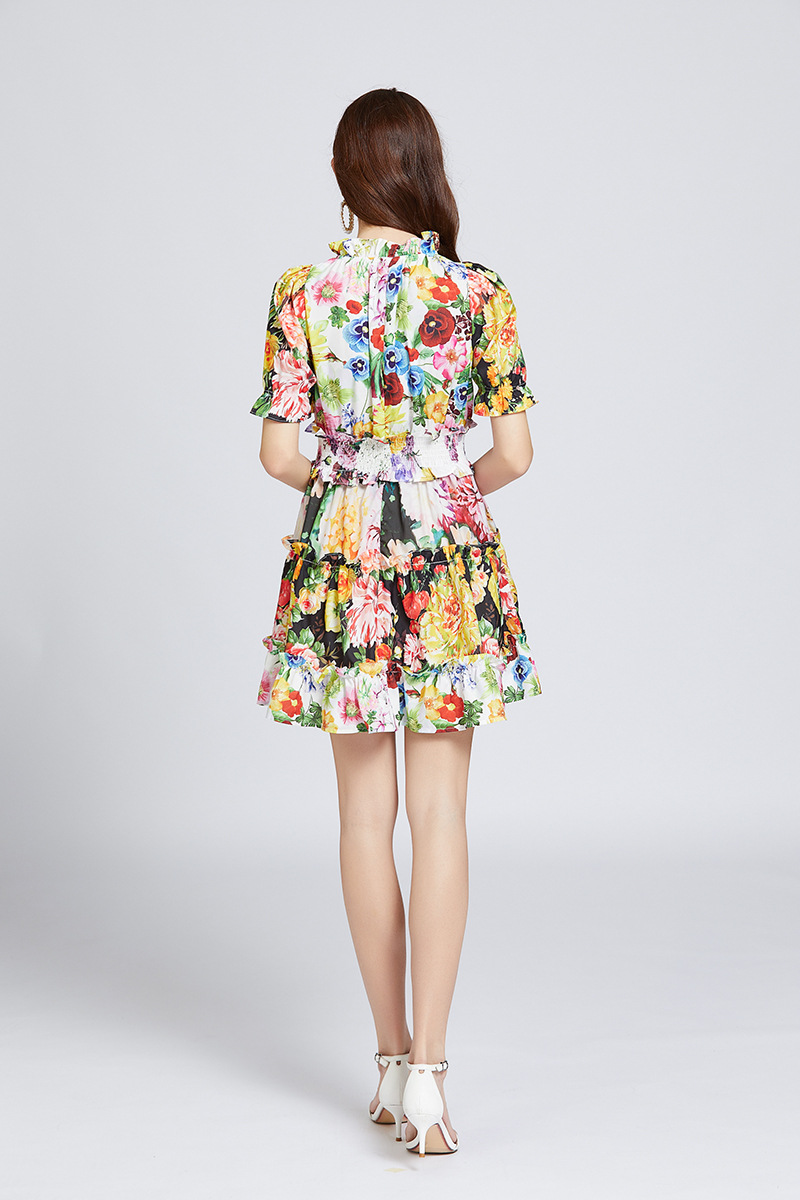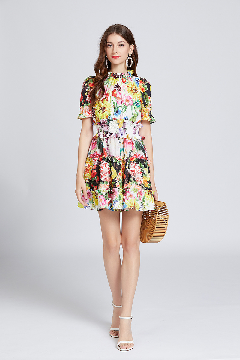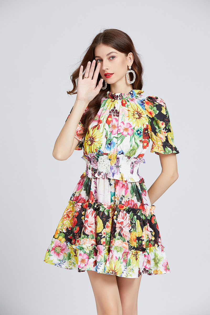 Three-color Printing Contrast Color Lotus Leaf Small High Collar Elastic High Waist Dress