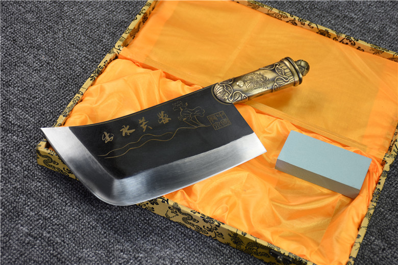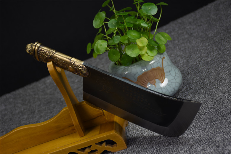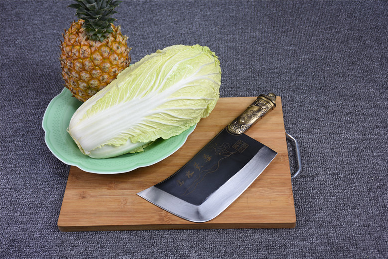Full length: 34cm Blade length: 22cmHandle length: 13cm Blade width: 11.5cmThickness: 0.6cm Blade material: T10 steelHandle material: copper Net weight: 1.23kg